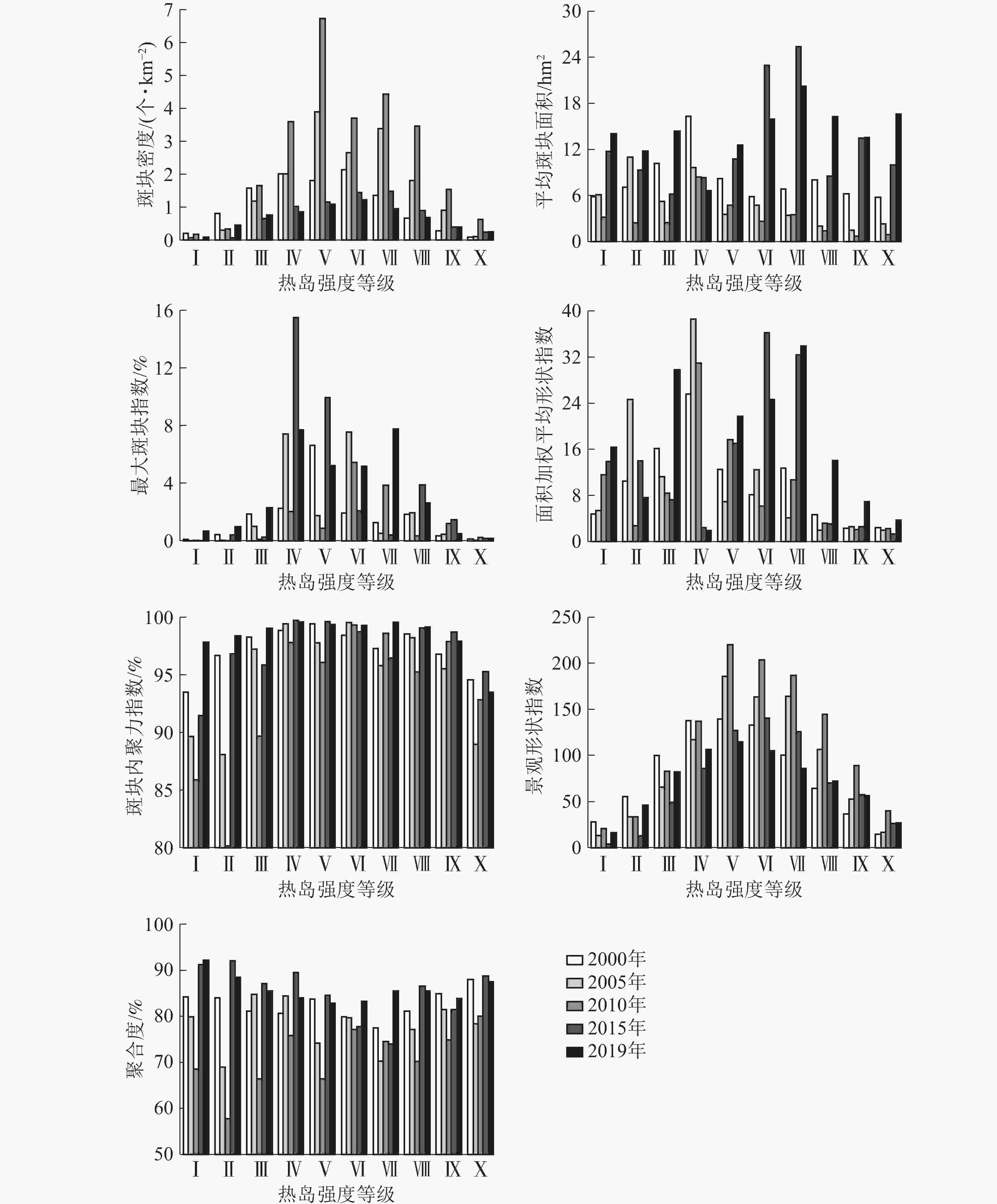 时间段 扩张面积/km2 ICS/% ICI/% 2000−2005 105.136 2 12.87 0.92 2005−2010 87.588 0 10.87 1.28 2010−2015 12.588 3 0.59 0.09 2015−2019 −5.462 1 −0.37 −0.06 平均值 49.962 6 5.99 0.56 表 3热力景观在景观水平上的景观指数变化