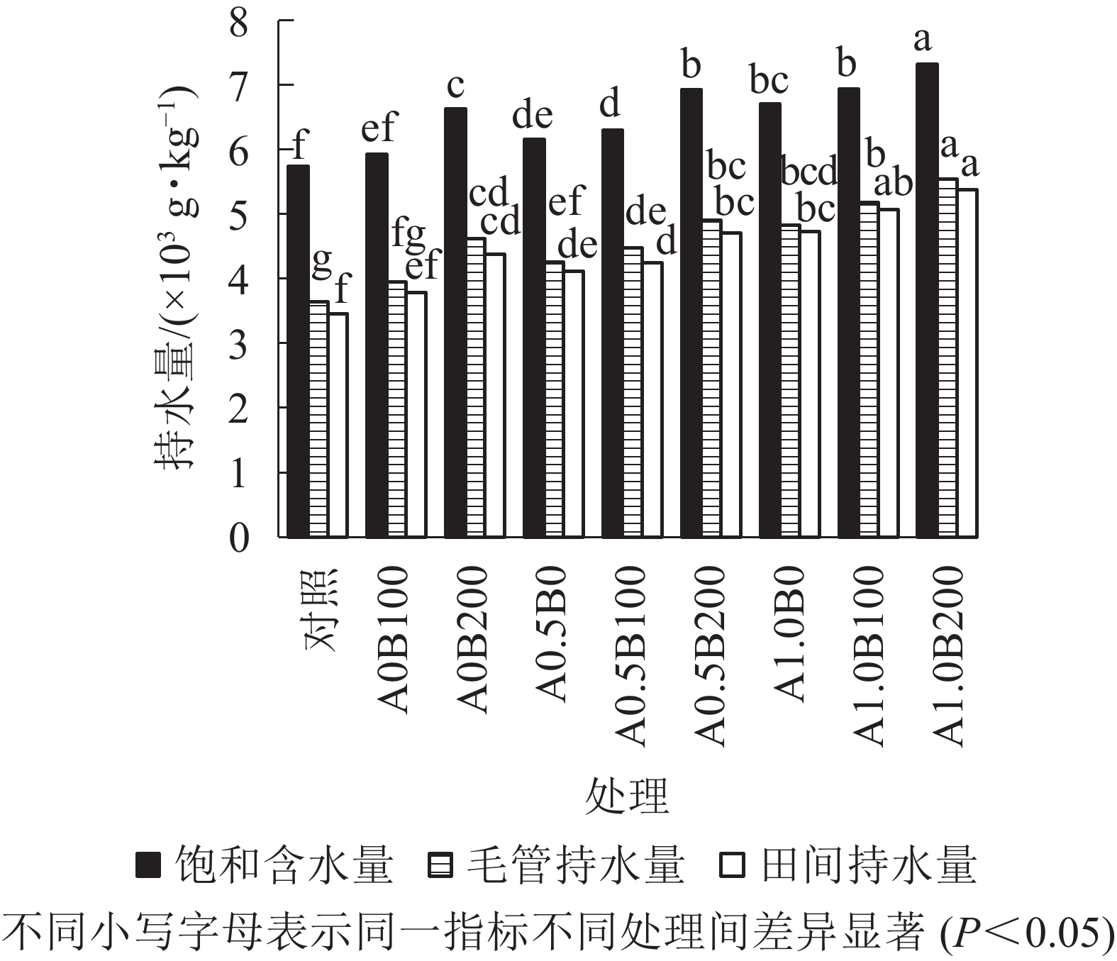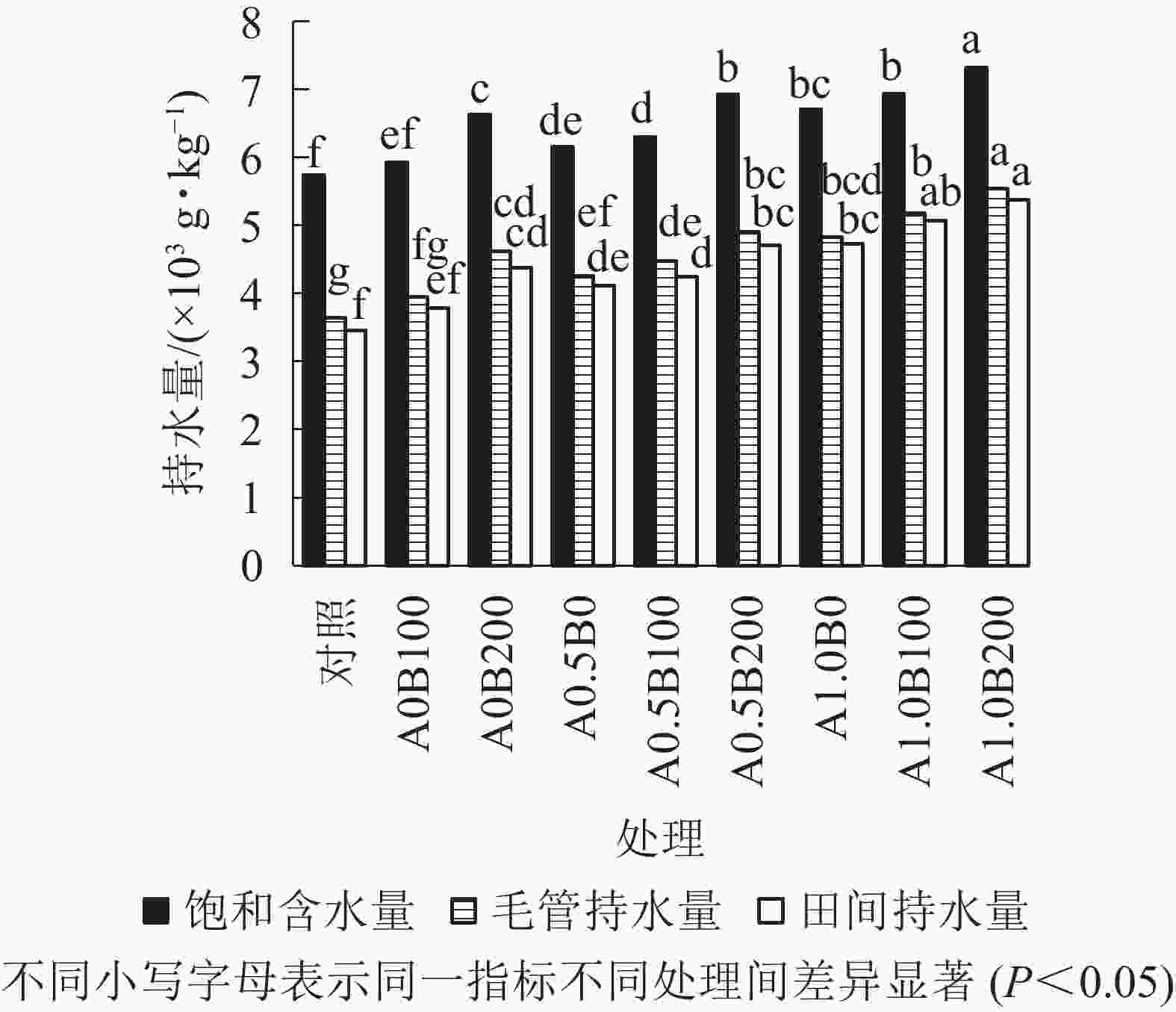 处理 容重/(g·cm−3) 总孔隙度/% 通气孔隙度/% 毛管孔隙度/% 水气比 对照 0.134 a 76.98 a 28.08 a 48.90 a 1.76 e A0B100 0.122 b 72.43 ab 24.04 b 48.39 a 2.02 de A0B200 0.115 c 76.03 ab 22.94 bc 53.09 a 2.33 cd A0.5B0 0.119 b 73.28 ab 22.64 bcd 50.64 a 2.26 cd A0.5B100 0.113 bc 71.49 ab 20.53 cde 50.97 a 2.50 cd A0.5B200 0.099 d 68.42 b 19.94 de 48.48 a 2.43 cd A1.0B0 0.112 bc 75.20 ab 21.01 cd 54.19 a 2.60 bc A1.0B100 0.104 cd 71.80 ab 18.07 ef 53.73 a 2.99 ab A1.0B200 0.096 d 70.65 ab 17.11 f 53.54 a 3.14 a 说明:同列不同小写字母表示不同处理间差异显著(P<0.05) -