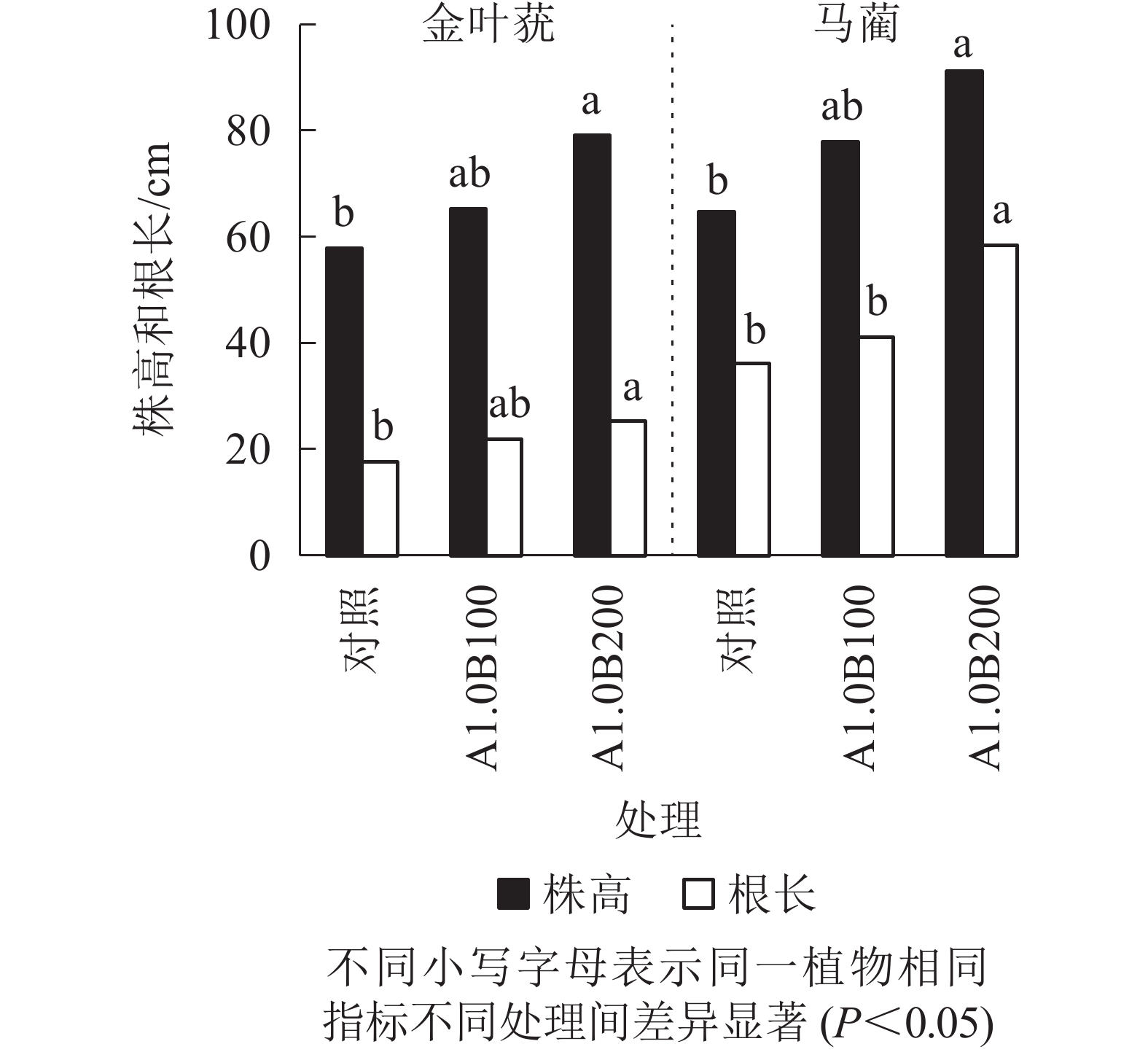 植物 处理 总鲜质量/g 根鲜质量/g 地上部鲜质量/g 根冠比 金叶莸 对照 49.74 b 14.03 b 35.71 b 0.39 a A1.0B100 61.09 ab 18.26 ab 42.83 ab 0.43 a A1.0B200 72.59 a 22.95 a 49.64 a 0.48 a 马蔺 对照 85.56 b 36.19 b 49.37 b 0.73 a A1.0B100 104.00 b 44.08 ab 59.92 ab 0.76 a A1.0B200 129.16 a 51.69 a 77.47 a 0.68 a 说明:同一植物相同指标不同小写字母表示不同处理间差异显著(P<0.05) -