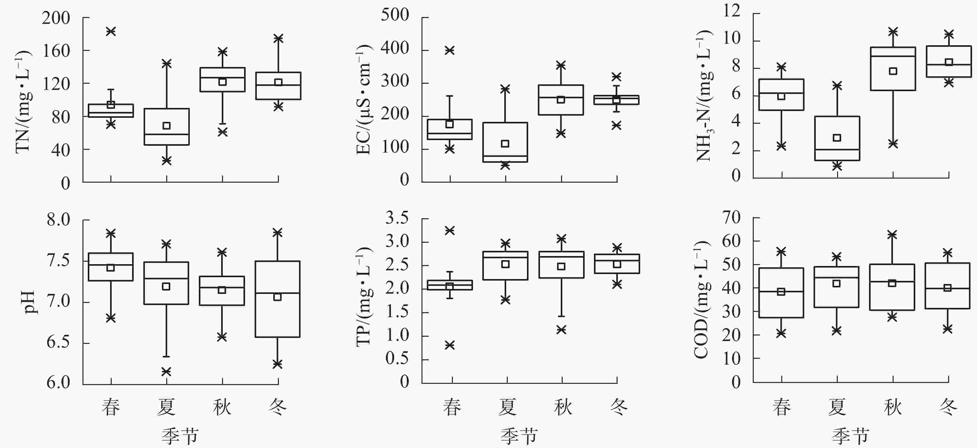 项目 pH EC/(μS·cm−1) TN/(mg·L−1) NH3-N/(mg·L−1) TP/(mg·L−1) COD/(mg·L−1) 限值 6.00~9.00 ≤140.00 ≤80.00 ≤8.00 ≤400.00 最大值 7.85 400.00 183.00 10.70 3.24 62.76 最小值 6.16 51.80 26.10 0.88 0.81 20.78 平均值±标准差 7.21±0.39 200.31±85.90 102.32±35.83 6.36±2.77 2.40±0.50 40.79±10.09 对不同季节的水质指标进行统计分析(图1)可以看出:秋、冬季TN和NH3-N的质量浓度及EC相比春、夏季较高;TP的质量浓度春季较小;COD四季变化规律不明显;pH在春季相对较高。