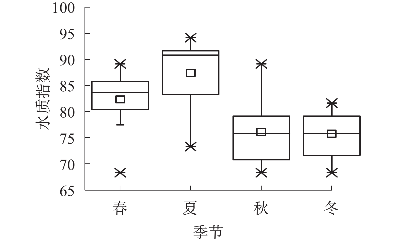 将采样数据代入水质指数公式的计算结果表明:81组样本中有64组等级为好,占比为79.0%,等级为一般和很好的样本分别占8.6%和12.4%。从图2可以看出:不同季节中水质指数差异较大,秋、冬季的污水水质指数相对较低,平均为60~80,而春、夏季的水质指数显著增大,平均为75~95,尤其在夏季较为突出,这表明总体上春、夏季的水质较好。