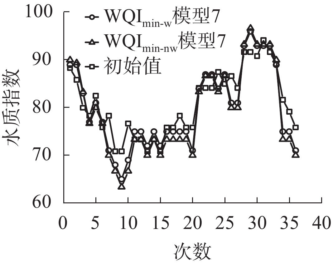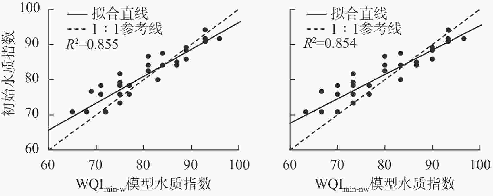以模型7为验证对象,将加权最小水质指数模型WQImin-w和非加权最小水质指数模型WQImin-nw进行对比验证。首先基于决定系数(R2)、残差平方和(RSS)以及显著性(P)来判断模型本身的拟合优度和精度,再将基于WQImin-w、WQImin-nw计算得到的WQI值,与通过初始5个指标计算得到的WQI值的线性拟合效果判断模型的适用性。以EC和COD作为关键指标,将36组检验数据分别代入2个模型,进行精度检验。模型WQImin-w和WQImin-nw的P<0.001,其中模型WQImin-w的决定系数(0.994)略高于模型WQImin-nw(0.971),且模型WQImin-w的残差平方和(RSS)为1.327,小于模型WQImin-nw(6.580)。因此,模型WQImin-w的拟合优度和精度略高于模型WQImin-nw。为进一步判断模型的适用性,将检验样本数据分别代入2个模型,得到WQI值,与初始WQI值进行线性拟合分析。从图3可知:由模型WQImin-w得到的WQI值与初始WQI值具有更密切的相关性,其拟合直线决定系数为0.855,略高于模型WQImin-nw(0.854);模型WQImin-nw对应的样点与1∶1参考线的距离普遍较大,且偏离程度大于WQImin-w中拟合直线与1∶1参考直线的偏离程度。图4为分别通过2个模型以及初始WQI公式计算得到的36组水质指数,可以直观地看出:模型WQImin-w的WQI值与初始WQI值较为接近,而模型WQImin-nw的误差相对较大。可见,模型WQImin-w的水质评价结果与初始WQI水质评价结果一致程度更高(91.7%),而模型WQImin-nw的水质评价结果误差相对较大,一致程度仅为83.3%。综合以上对比结果,模型WQImin-w更适用于生猪养殖污水水质的评价。