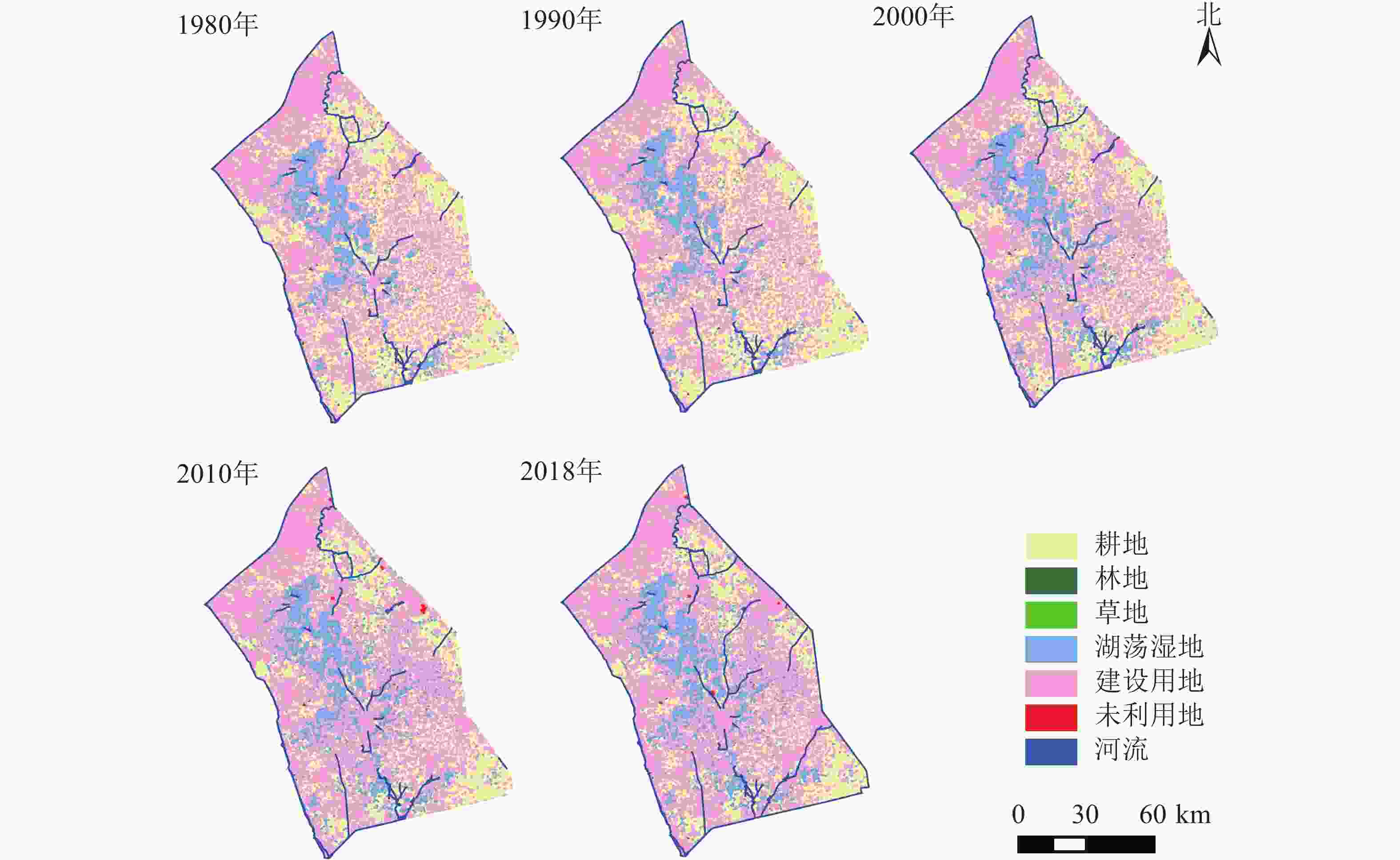 • 采用的1980、1990、2000、2010和2018年共5期土地利用类型矢量数据来源于中国科学院资源环境科学数据中心( http://www.resdc.cn/ )。在参考GB/T 21010—2007《土地利用现状分类》的基础上,结合研究区景观性质与特点,将景观分为7个一级类型:耕地、林地、草地、湖荡湿地、建设用地、未利用地和河流;其中,湖荡湿地进一步分为湖泊、水库坑塘、滩地与沼泽地。里下河平原5期景观类型图如图1所示。