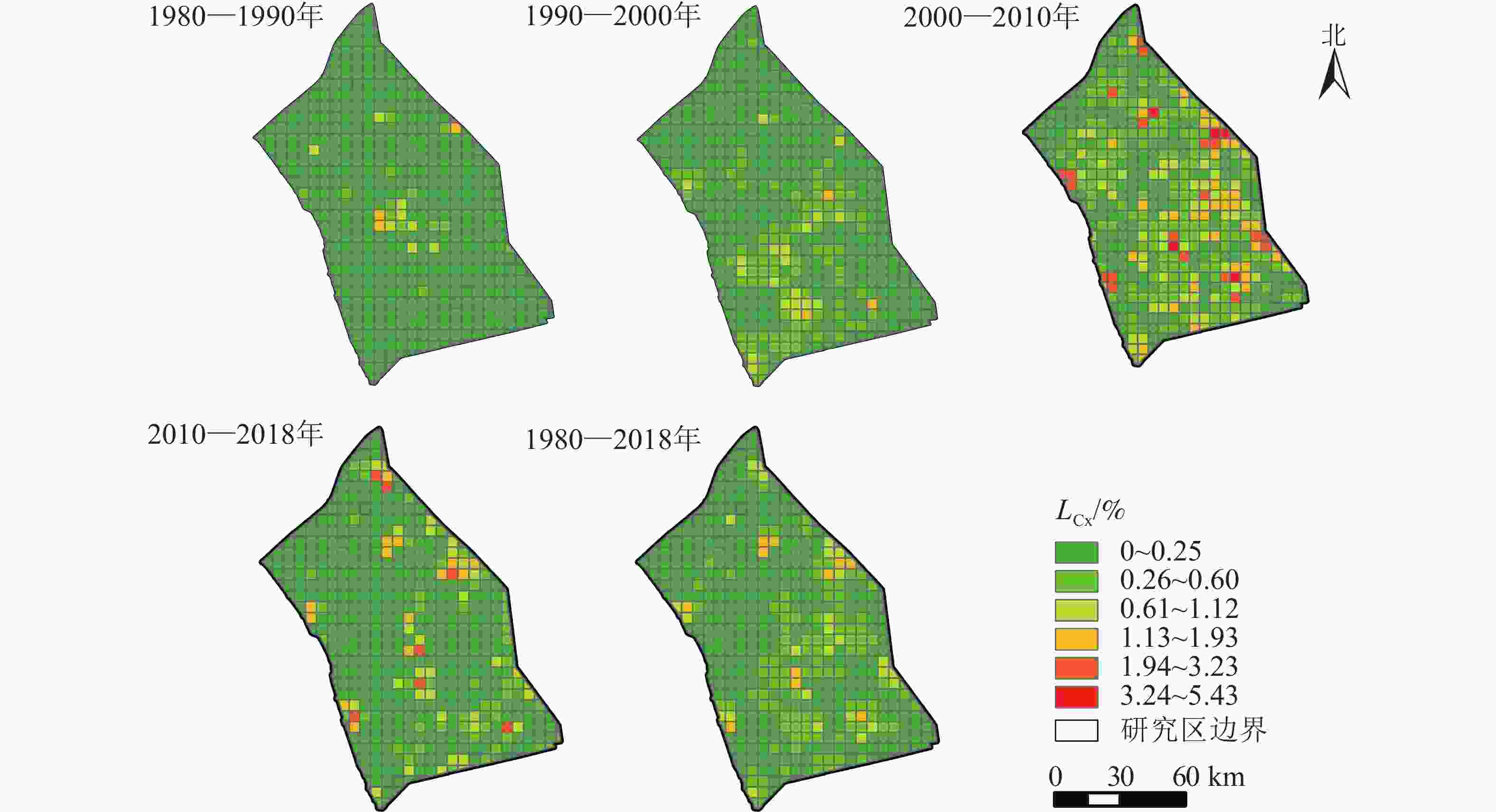• 图2可知:研究区在1980—2018年间,LCx>0.61%的网格面积占研究区7.06%,LCx>1.13%的只占2.10%。4期景观综合动态变化具有明显的时空差异。1980—1990年间,LCx>0.61%的网格面积占比仅2.10%,LCx>1.13%的网格面积只占0.57%,主要分布在里下河中部的兴化市内,其景观动态变化相对较大。1990—2000年,研究区的景观动态发生了显著变化,由中部地区向东北和西南方向扩张,高邮市与江都区内的景观变化速度加快。LCx>0.61%的网格面积增加到4.39%,LCx>1.13%的网格面积占0.57%。2000—2010年是研究区景观变化最为剧烈的时期,大多数区域的景观都发生了不同程度的变化。具有高动态度的网格明显增加,LCx>1.13%的网格面积占研究区的11.45%,LCx>1.94%的网格面积占4.77%。2010—2018年的LCx有明显的回落,景观综合动态变化有所放缓,LCx>1.13%的网格面积减少到4.01%。里下河平原近40 a的景观综合动态度经历了“缓慢变化—快速变化—变化减缓”的发展趋势。