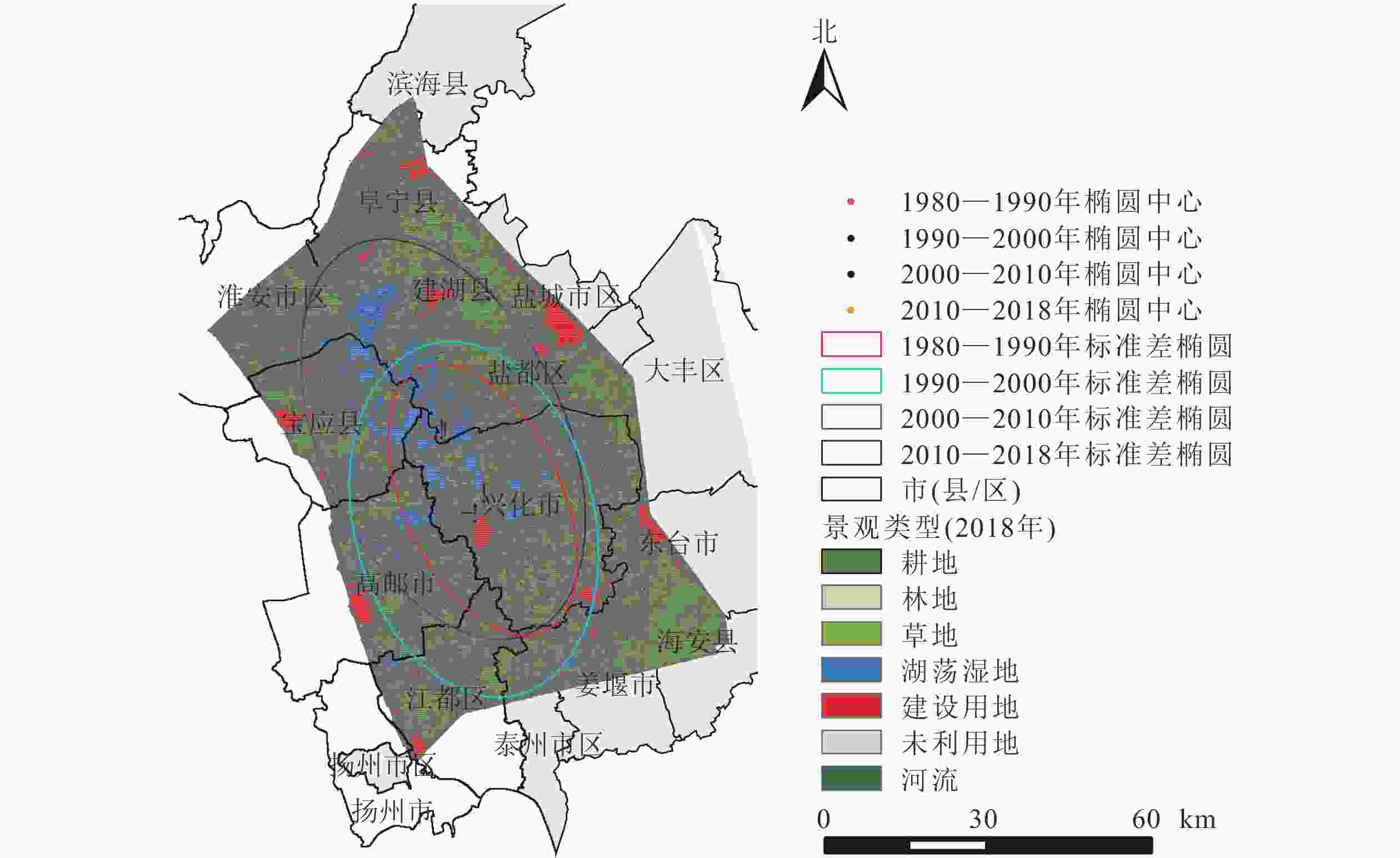 • 标准差椭圆可以在一定程度上反映研究要素的总体轮廓和主导分布方向[26-27]。标准差椭圆工具由3个基本要素组成,长半轴代表数据演化的主导方向,短半轴表示数据分布的范围,具体的计算过程见文献[28]。采用标准差椭圆分析里下河平原1980—2018年不同时期景观类型变化的方向和速度。