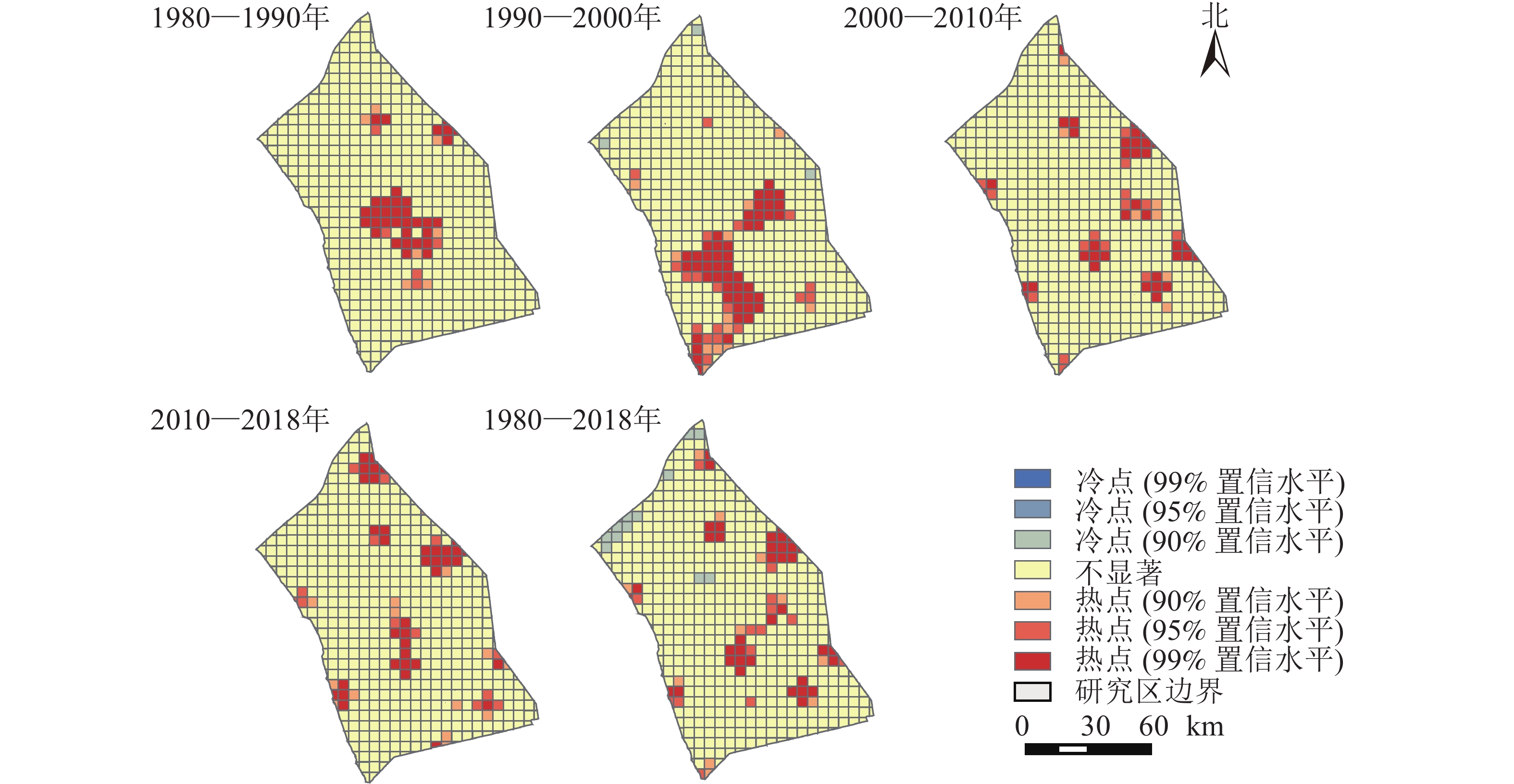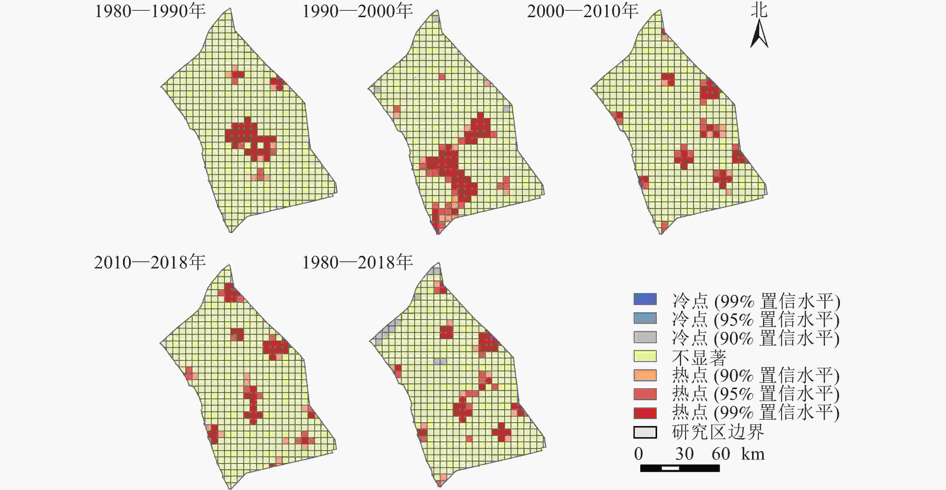• 热点分析可以得到高值或低值要素在空间上的集聚状况,具体的计算公式可参考文献[29-30]。采用Getis-Ord Gi*热点分析工具对里下河平原1980—2018年的景观综合动态度进行冷热点统计。