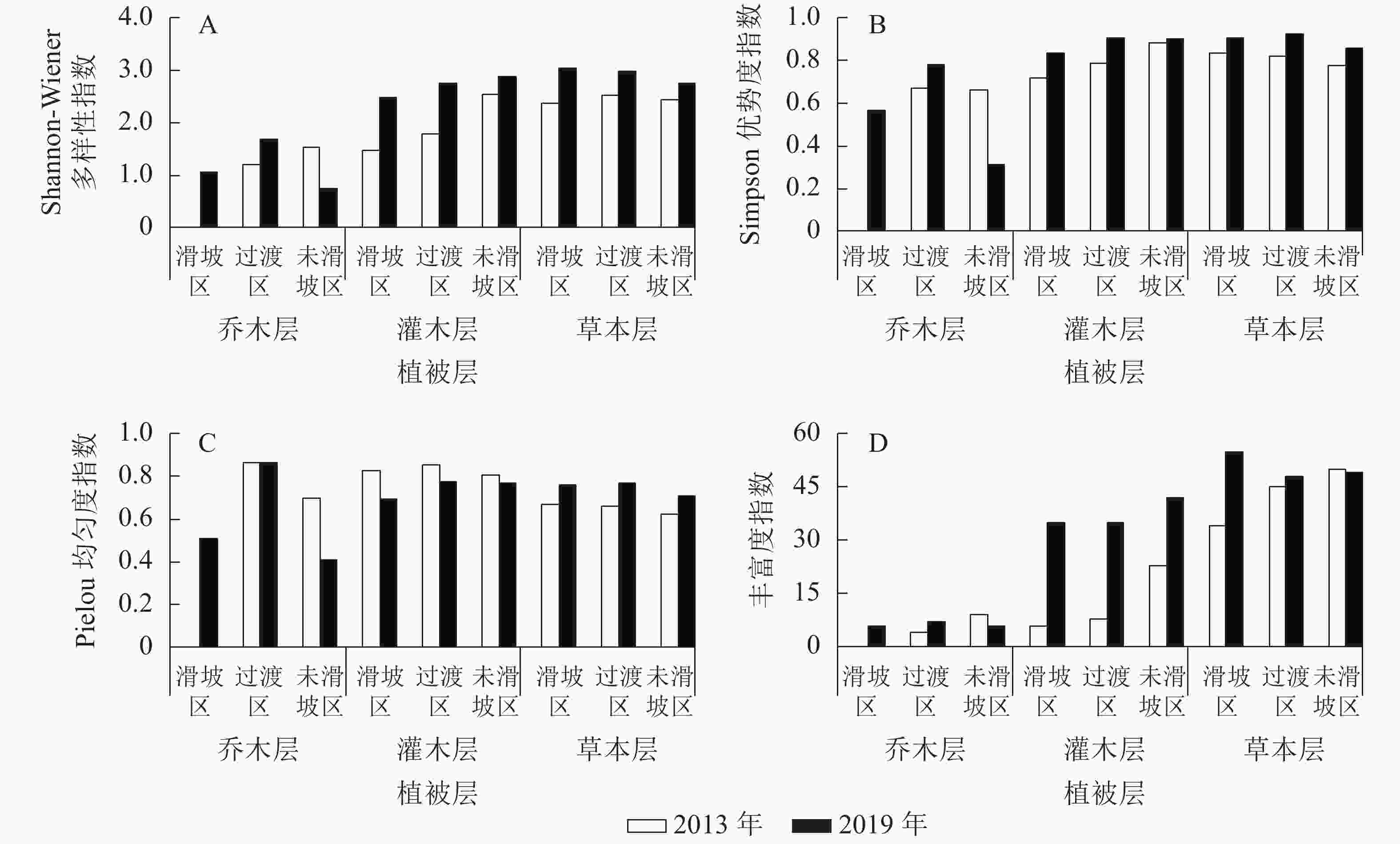 2019年滑坡迹地3个区域菊科和禾本科草本植物所占比例较2013年均有所下降;未滑坡区的乔木层科属种数和草本层的属数及种数减少,其他均增加;Shannon-Wiener多样性指数和Simpson优势度指数均表现为未滑坡区乔木层减小,其余增大;各区域草本层的Pielou均匀度指数均增大;未滑坡区乔木层和草本层的丰富度指数减小,其余增大。