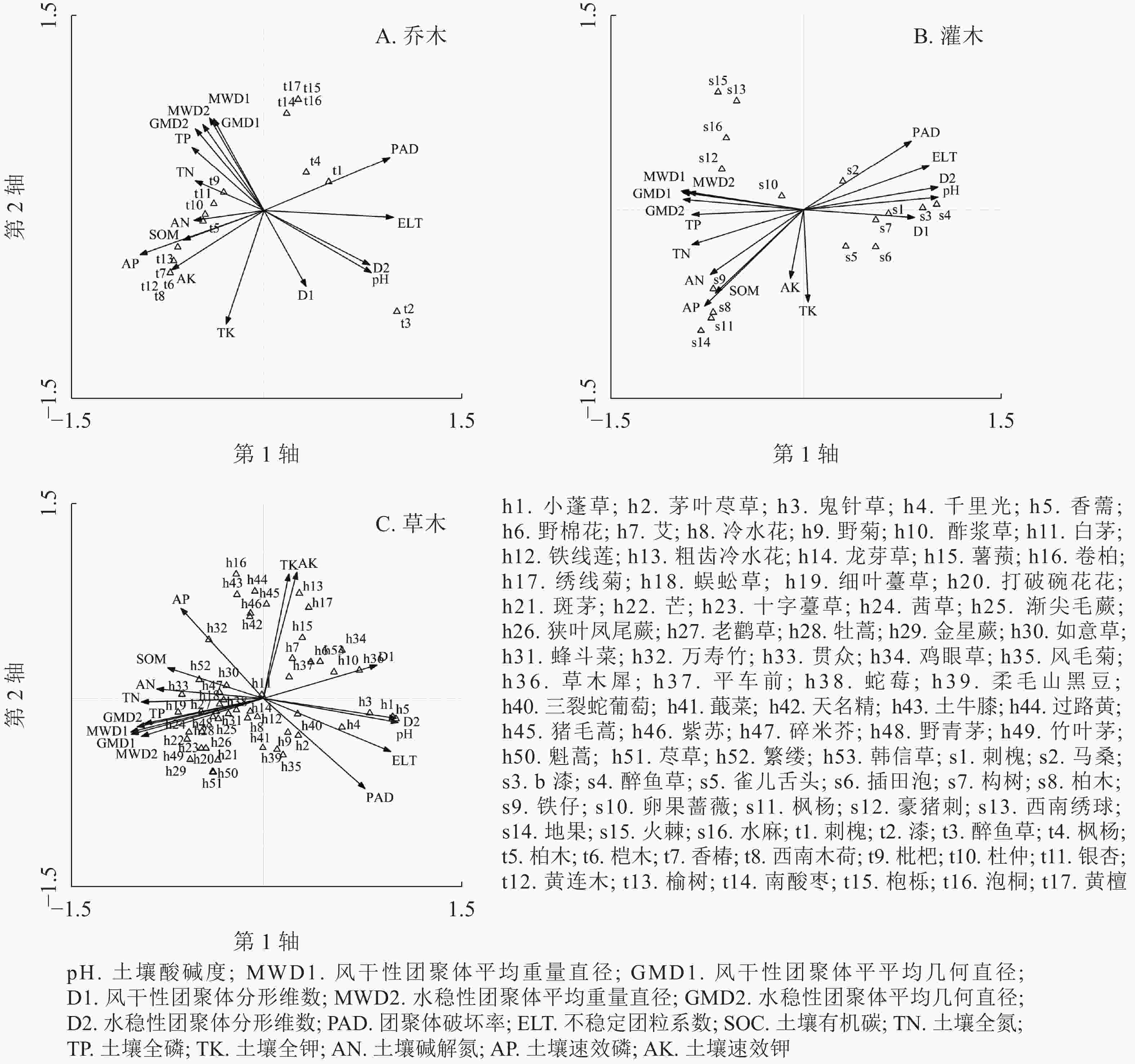 植被层 排序轴 pH MWD1 GMD1 D1 MWD2 GMD2 D2 乔木层 第1轴 0.768 5* −0.390 5 −0.361 1 0.301 5 −0.437 9 −0.491 2 0.757 7* 第2轴 −0.447 6 0.6691 0.661 3 −0.546 0 0.619 7 0.5895 −0.392 5 灌木层 第1轴 0.961 1** −0.874 4* −0.866 0* 0.793 3* −0.822 7* −0.861 3* 0.960 6** 第2轴 0.088 9 0.134 5 0.123 2 −0.057 4 0.1239 0.072 4 0.162 2 草本层 第1轴 0.967 1** −0.950 1** −0.946 8** 0.814 5* −0.874 5* −0.905 1** 0.953 6** 第2轴 −0.172 9 −0.242 1 −0.258 7 0.239 5 −0.274 0 −0.204 2 −0.144 6 植被层 排序轴 PAD ELT SOC TN TP TK AN 乔木层 第1轴 0.900 5** 0.925 5** −0.556 9 −0.491 4 −0.515 9 −0.271 4 −0.504 7 第2轴 0.380 9 −0.0487 −0.305 8 0.212 7 0.4562 −0.816 1* −0.128 0 灌木层 第1轴 0.769 0* 0.898 0** −0.540 6 −0.799 5* −0.797 9* 0.031 3 −0.641 2 第2轴 0.495 4 0.319 5 −0.684 7 −0.254 2 −0.035 7 −0.665 8 −0.514 7 草本层 第1轴 0.728 5 0.913 3** −0.576 8 −0.8745* −0.8515* 0.1834 −0.733 7* 第2轴 −0.648 0 −0.382 5 0.269 6 −0.026 1 −0.181 6 0.896 8** 0.103 0 植被层 排序轴 AP AK 特征值占比/% 累积贡献率/% 乔木层 第1轴 −0.886 8** −0.660 9 51.97 52.00 第2轴 −0.317 7 −0.426 2 25.88 77.90 灌木层 第1轴 −0.708 4 −0.095 3 43.77 43.80 第2轴 −0.696 3 −0.495 9 30.67 74.40 草本层 第1轴 −0.590 9 0.241 5 40.15 40.20 第2轴 0.650 6 0.909 1** 26.09 66.30 说明:pH. 土壤酸碱度;MWD1. 风干性团聚体平均质量直径;GMD1. 风干性团聚体平平均几何直径;D1. 风干性团聚体分形