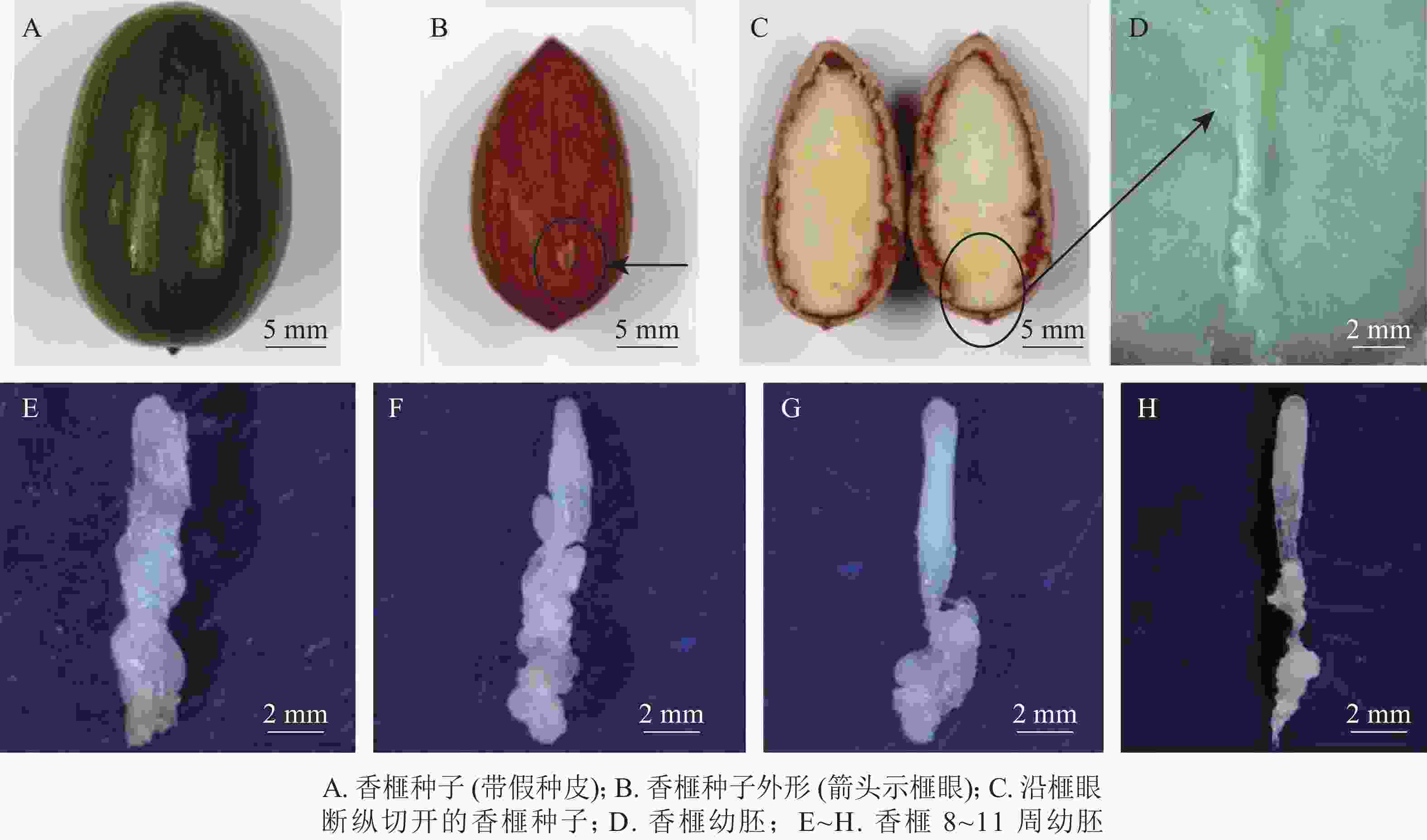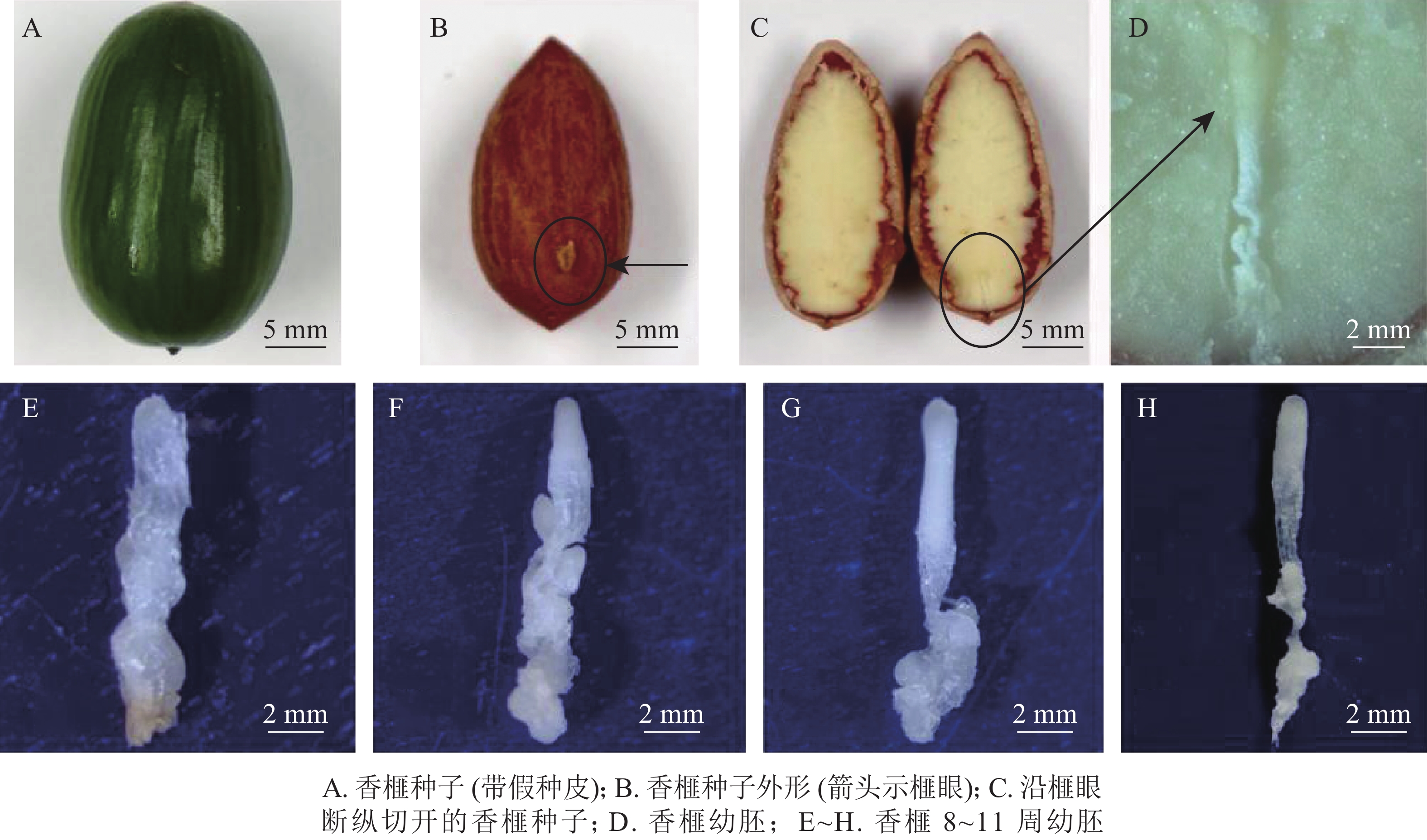 于2018年7月5—26日(种子突破种鳞后第8~11周,以下简称第8~11周)采集生长健壮的香榧种子,经消毒后,用无菌修枝剪从种子榧眼端(珠孔端)纵向剪开,剥取完整幼胚(图1A~D)待用。具体消毒步骤参照龚丽等[17]的方法。