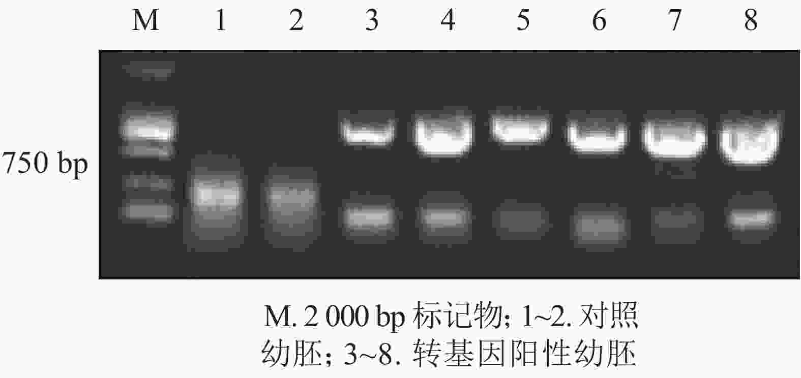 为进一步排除GFP绿色荧光假阳性,本研究选取具有潮霉素抗性且GFP强荧光信号表达的香榧幼胚培养物提取DNA并进行PCR扩增,并以同时接种未转化的幼胚为对照。香榧GFP荧光阳性幼胚培养物提取DNA进行PCR检测结果表明(图3):75%的携带潮霉素抗性且GFP荧光阳性香榧幼胚培养物可扩增出目的条带,长度约750 bp,符合预期大小(泳道3~8),而对照幼胚培养物相应无条带(泳道1~2),表明GFP基因已成功转入香榧幼胚。