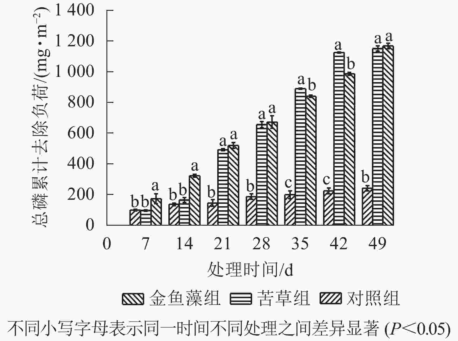 随着处理时间的延长,2组植物净化系统总磷累计去除负荷呈逐渐增加趋势(图1)。至试验结束时(第49 天),苦草组和金鱼藻组净化系统的累计去除负荷分别为1 151.17和1 167.50 mg·m−2,对应总磷去除率分别为82.8%和84.0%。方差分析表明:试验结束时2组植物系统总磷去除效率无显著差异(P>0.05),但均显著好于无植物的对照组(P<0.05)。进一步对各周总磷去除负荷分析发现(图2):2组植物系统各周之间的总磷去除负荷均存在较大波动,并且均在第3周出现峰值,单周贡献了整个试验期间(共7周)总磷累计去负荷的28.5%(苦草组)和16.7%(金鱼藻组)。无植物的对照组总磷去除负荷在第1周出现峰值。