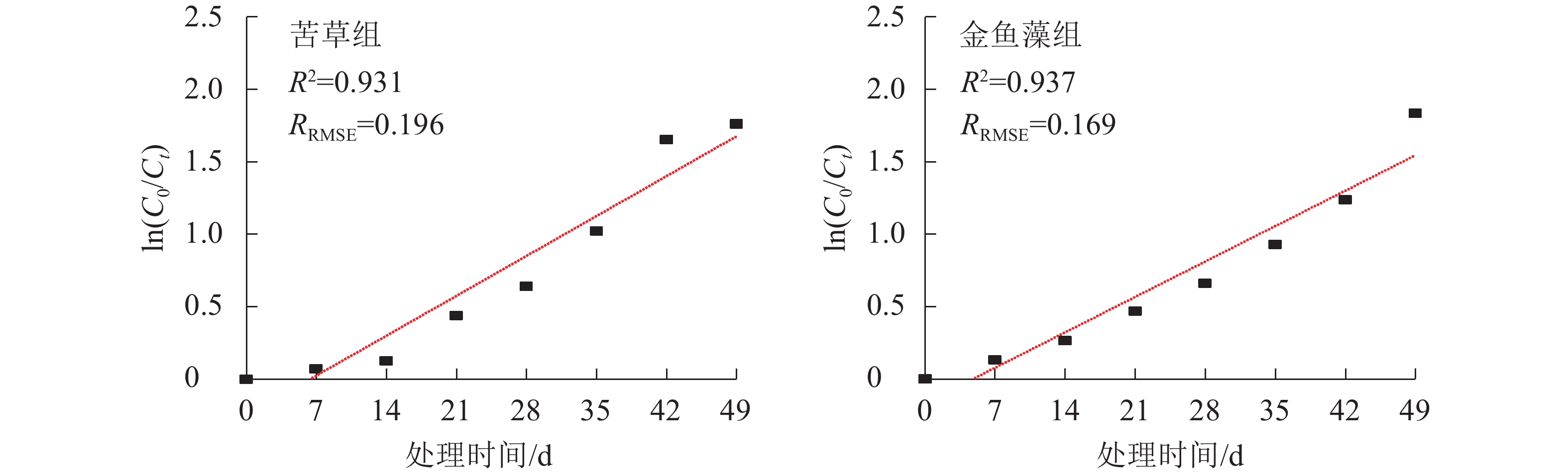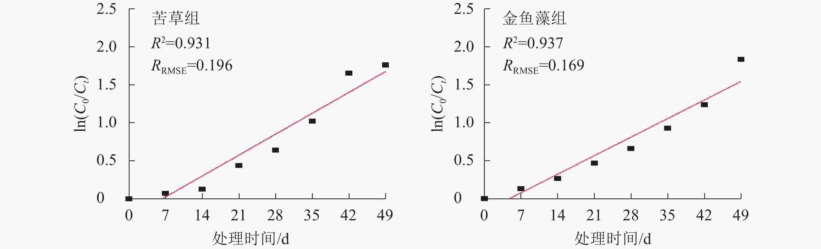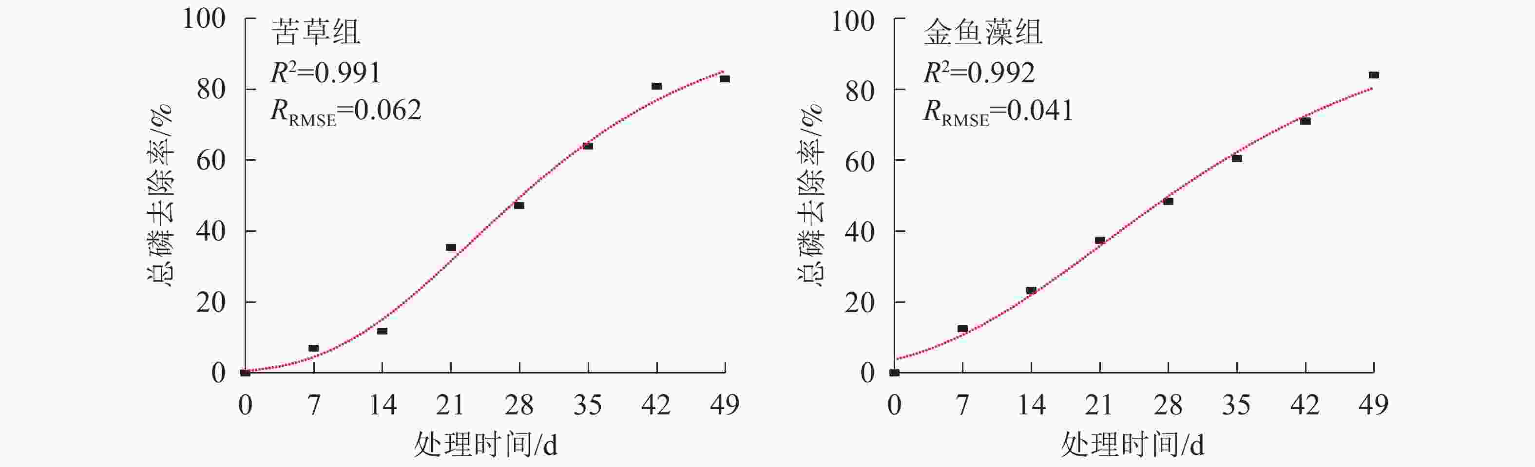 在不同时间尺度上比较2组植物净化系统总磷去除效率发现(图1):尽管在试验结束时(第49 天)和试验中期(第21 天和第28 天)两者差异不显著,但在试验初期(第7 天和第14 天)和中后期(第35 天和第42 天)2组植物净化系统总磷去除效率存在差异显著(P<0.05)。其中试验初期,金鱼藻组净化系统总磷去除效率显著高于苦草组净化系统;而当处理时间增至35和42 d时,苦草组又显著高于金鱼藻组。这种不同沉水植物系统除磷效率的差异在不同时间尺度上出现偏离甚至逆转的现象可能具有一定的普通性,如文献[29]、文献[30]和文献[31]的研究中均存在这种现象。值得注意的是,忽视植物效应差异的不确性,可能会导致水生植物净化系统工艺优化,特别是水生植物的筛选结果出现偏离甚至失真,因此,有必要借助污染物去除动力学模拟分析获取用于指示和预测污染物去除效率的相关特征参数。
