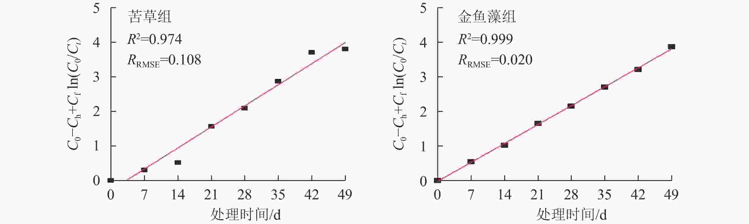 图4为Monod动力学模型f(C0,Ct,Ch)与净化处理时间(t)之间的回归曲线,表2列出了由回归系数求得的总磷最大体积去除速率常数(Mmax)以及统计验证参数。结果表明:Monod动力学模型可以较好地拟合2组沉水植物系统总磷的去除过程(R2>0.970,RRMSE<0.110)。2组植物系统拟合得到的总磷最大体积去除速率分别为87.14 mg·m−3·d−1(苦草组)和78.15 mg·m−3·d−1(金鱼藻组),并且差异达到显著性水平(P<0.05)。