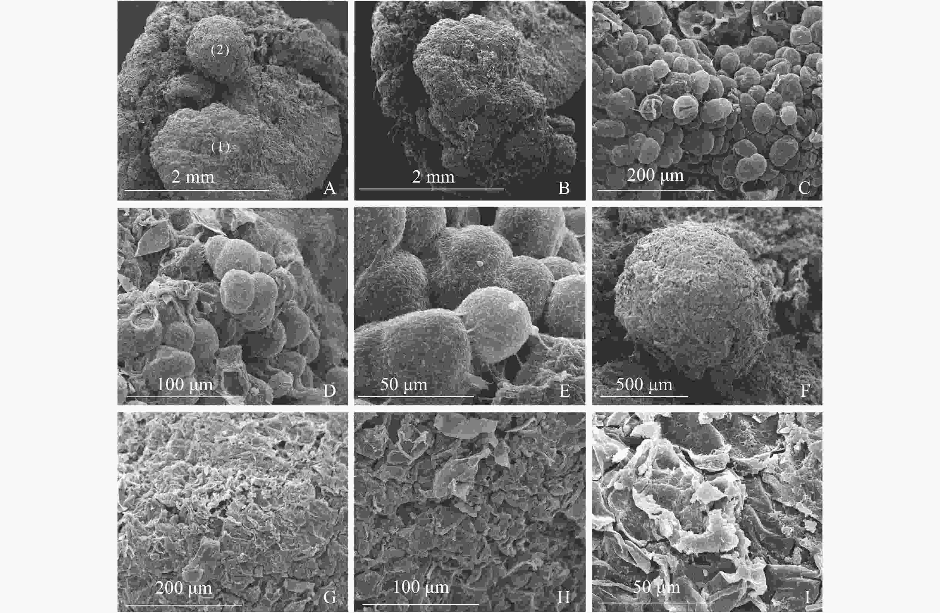 图3A显示同一插穗上2种不同类型的愈伤组织,①为白色、透明、块状的愈伤组织,②为浅黄色、不透明、点状的愈伤组织。白色块状愈伤组织表面有很多凸出且大小均一的球形细胞,细胞间间隙较小,为胚性愈伤组织细胞(图3B和图3C),多以细胞团的形式存在(图3D),表面黏液较多,且带有少量絮状附着物(图3E)。从图3F发现:浅黄色点状愈伤组织表面粗糙,细胞大多死亡破裂(图3G),细胞表面有附着物(图3H),在死亡破裂的细胞之间存在间隙,表面存在凹陷(图3I)。