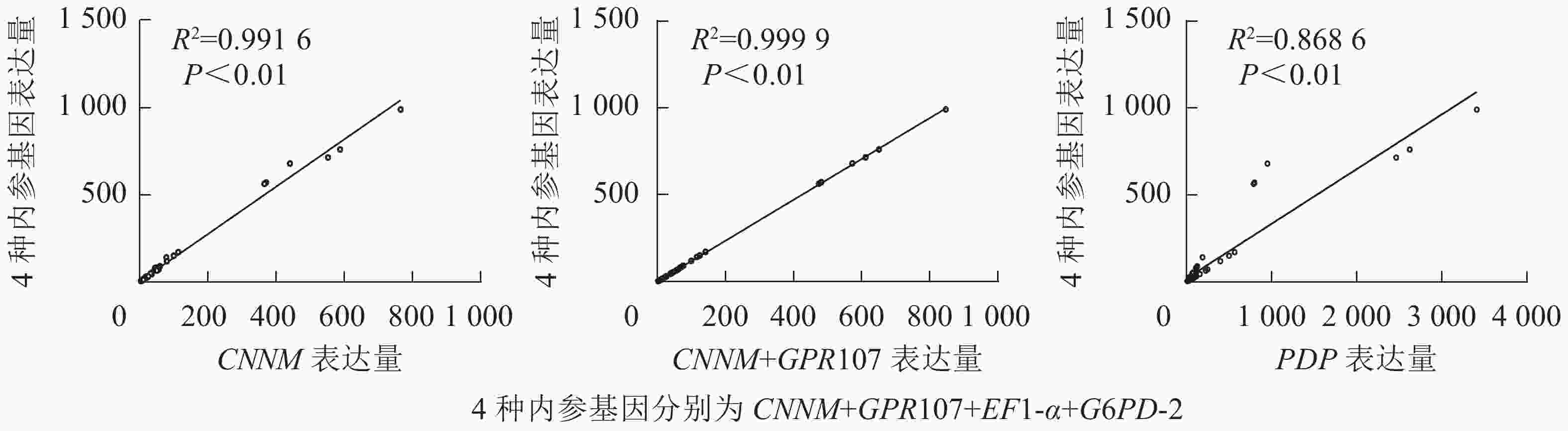 从图6可见:利用最差内参PDP得到的目的基因表达量与4种内参基因组合得到的目的基因表达量相关系数为0.868 6 (P<0.01),当使用最优基因CNNM作为内参时,与4种内参组合相关系数可达0.991 6 (P<0.01)。对2种内参组合与geNorm推荐的4个数目内参组合比较发现:通过这2种方法标准化得到的目的基因相关性可达0.999 9 (P<0.01),即仅使用CNNM、GPR107基因作为双内参也可达到geNorm软件推荐的4个内参数目组合的效果。