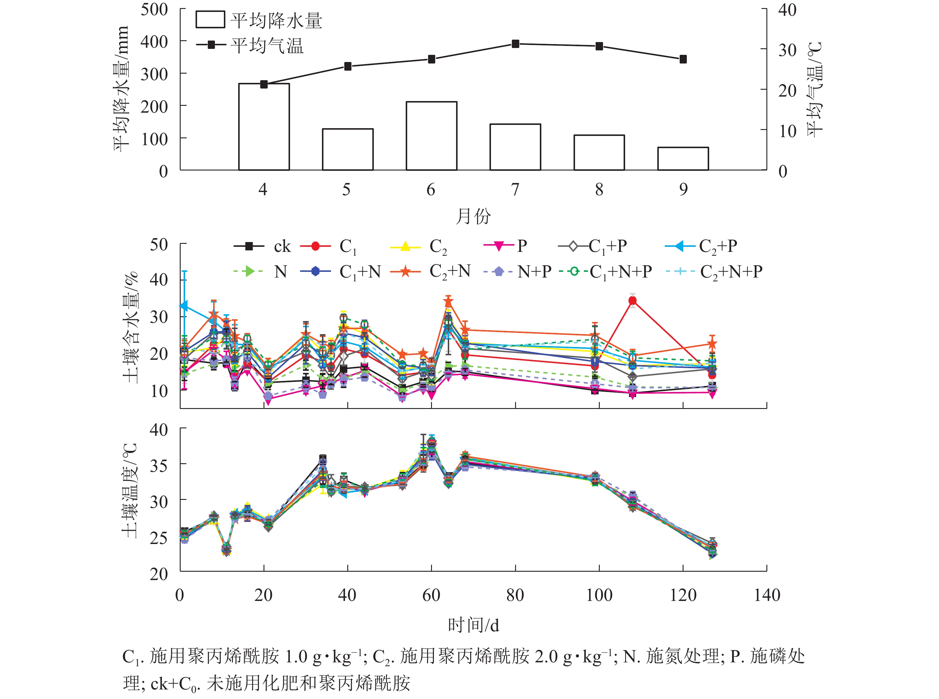 盆栽试验于2018年4月17日至9月26日进行,盆栽容器为高18 cm,宽16 cm的圆形花盆,每盆土质量为1 500 g。试验共设置12个处理:C0+ck、C0+P、C0+N、C0+N+P、C1+ck、C1+P、C1+N、C1+N+P、C2+ck、C2+P、C2+N、C2+N+P。其中,C0、C1、C2分别为施用保水剂聚丙烯酰胺0、1.0、2.0 g·kg−1。每个处理3个重复,聚丙烯酰胺与土壤混施,氮磷肥加水混合均匀喷施。共施肥3次,分别为6月1日(0.050 g·kg−1N,0.025 g·kg−1P)、6月24日(0.040 g·kg−1N,0.020 g·kg−1P)和7月18日(0.040 g·kg−1N,0.020 g·kg−1P),共施氮肥0.130 g·kg−1,磷肥0.065 g·kg−1。