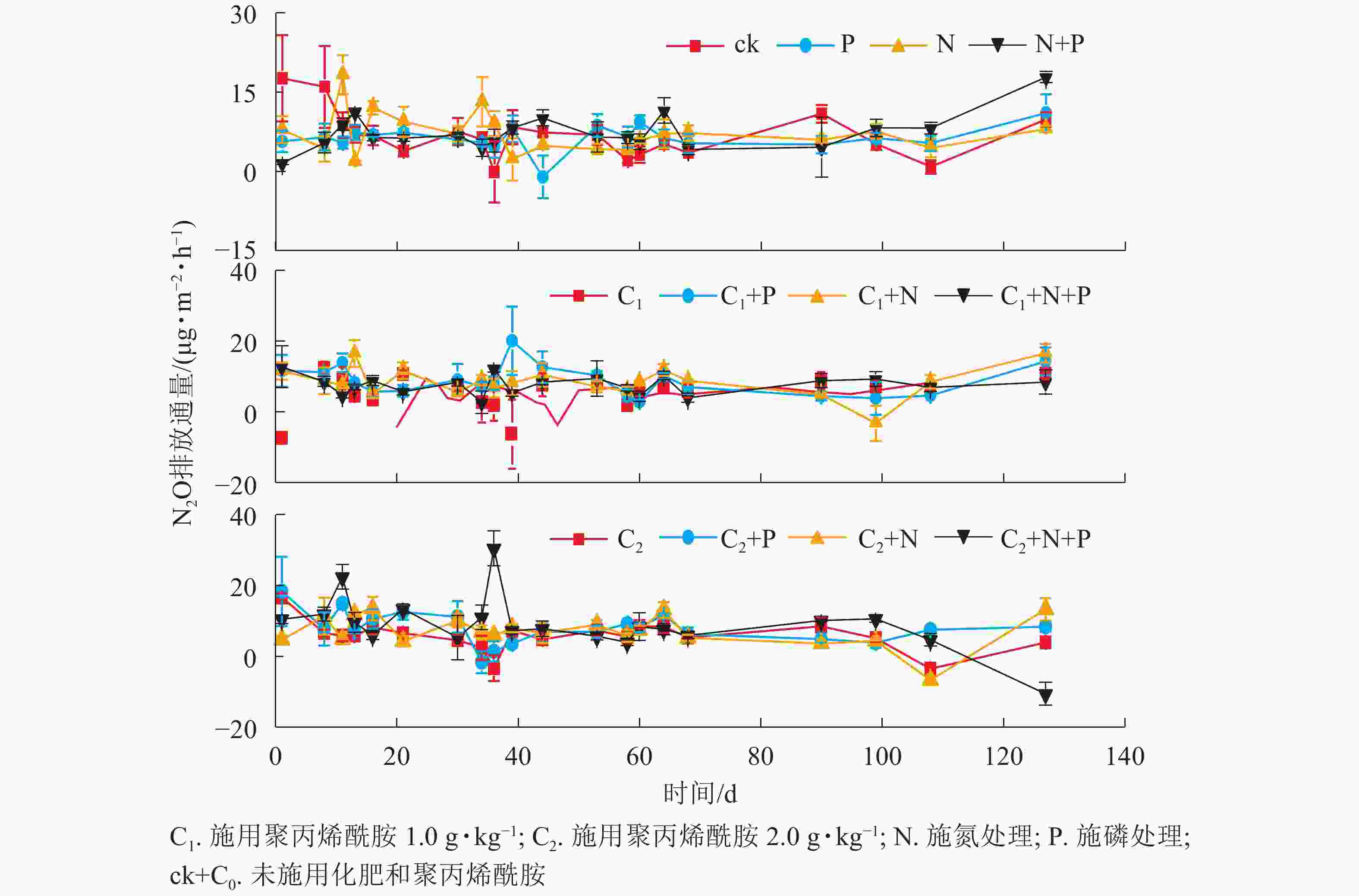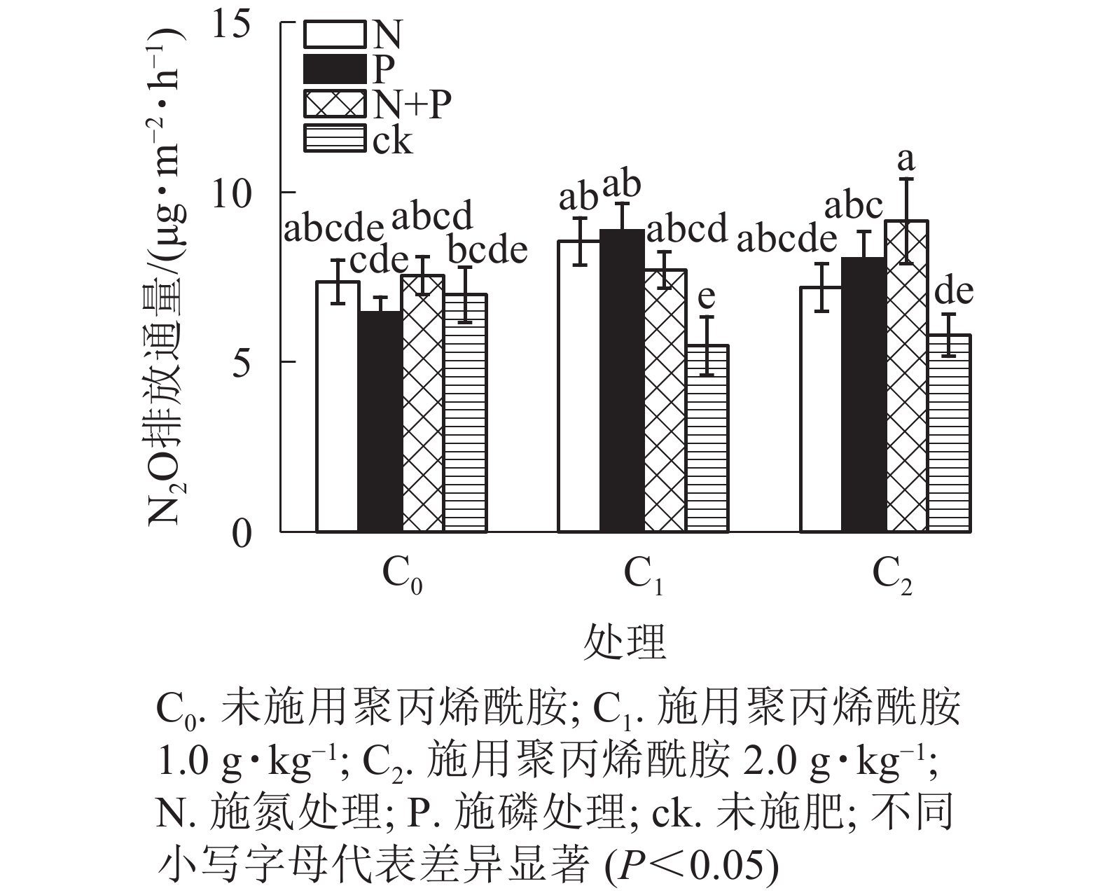 处理 df F N2O排放通量 土壤含水量 N2O累积排放量 N 1 5.41* 13.72** 1.35 P 1 6.27* 5.05* 5.41* N+P 1 2.23 4.19 0.49 C 2 0.66 200.89** 2.75 N+C 2 0.13 1.34 0.18 P+C 2 2.45 3.78* 2.24 N+P+C 2 3.13* 4.17* 1.71 说明:N表示施氮处理,P表示施磷处理,C表示施加聚丙烯 酰胺处理;*P<0.05,**P<0.01 -