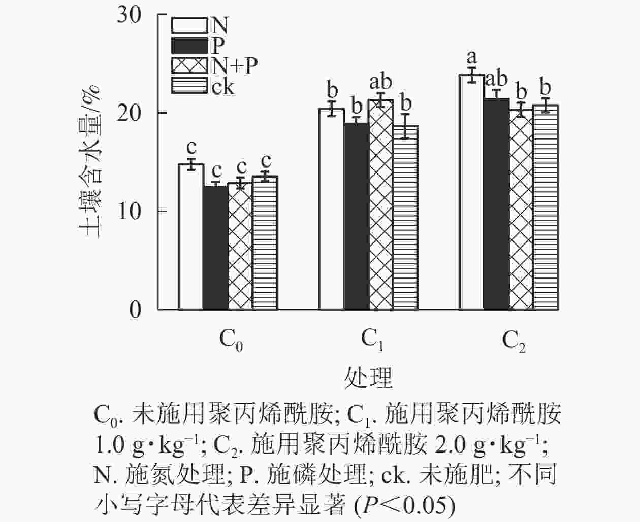 由表1和图3可见:未施肥条件下,C1和C2处理土壤含水量较之C0,分别增加37.5%、53.2%(P<0.05);单施N条件下,土壤含水量从大到小依次为C2、C1、C0,与C0对比,C1和C2分别增加38.3%、61.4%(P<0.05);单施P条件下,C1和C2处理土壤含水量较之C0,分别增加51.4%、71.6%(P<0.05);施N+P条件下,C1和C2处理土壤含水量较之C0,分别增加65.4%、57.6%(P<0.05)。总体上,C1、C2处理土壤含水量均显著高于C0,说明聚丙烯酰胺可以有效提高土壤保水性能。