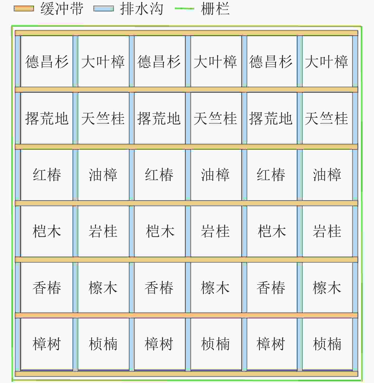 2015年春季,采用随机区组设计建立了同质园试验区。样地前期为农耕地,经营历史相同,土壤均一,地势平坦。种植前,对同质园进行了翻耕,使样地土壤更加均一,本底土壤理化性质基本一致。统一选用2年生树苗,按2 m×2 m的株行距挖穴造林,初植林分密度为1 600株·hm−2。每个样地面积为25 m×25 m,每个树种设置3个重复样地,在各样地边缘设置宽度为1 m的排水沟和缓冲带。造林后进行统一管理,使其自然生长,并且围建栅栏以防止人为活动的干扰(图1)。