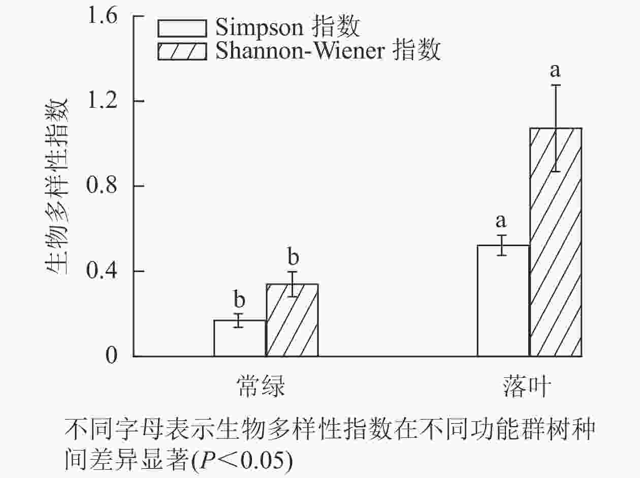 不同功能群树种林分的林下植被多样性存在显著差异,落叶树种林分的林下草本层Simpson多样性指数和Shannon-Wiener多样性指数均显著高于常绿树种林分(图6)。