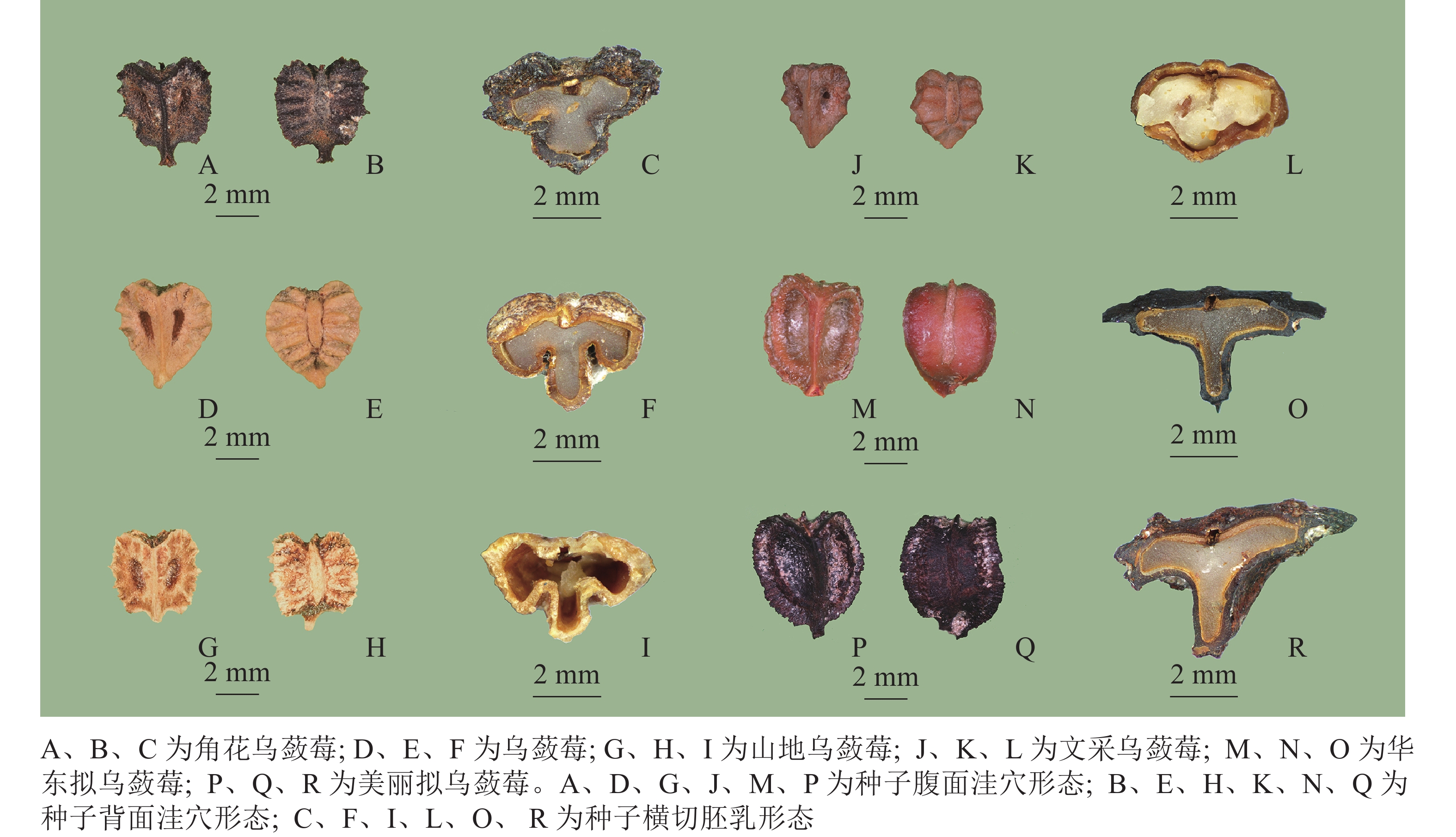 观察种子形态的共有6种,6个样品。在对种子样品观察时,先剥去果实外果皮、果肉,取出种子,在清水中揉搓,去除膜质层后晾干。每个种随机取出10粒种子,测量大小(种子长度和宽度),并在解剖镜下观察和描述种子的背面、腹面洼穴形态和横切胚乳形状,逐一记录后拍照。