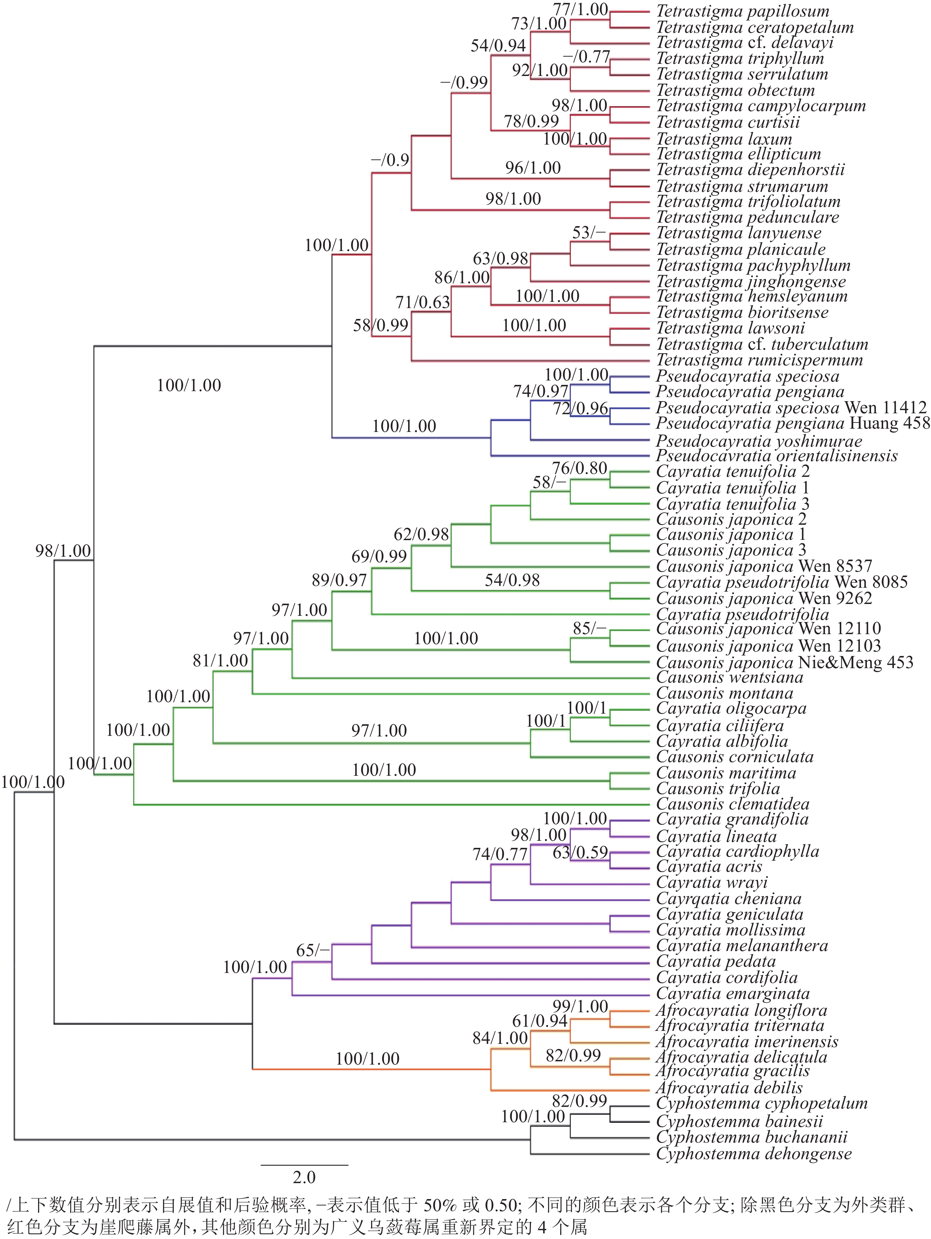 综合考虑形态特征、种子形态和系统发育关系等多方面的证据,将薄叶乌蔹莓和白毛拟乌蔹莓分别作为乌蔹莓和美丽乌蔹莓的亚种处理,尖叶乌蔹莓归属发生改变,故作出如下组合。