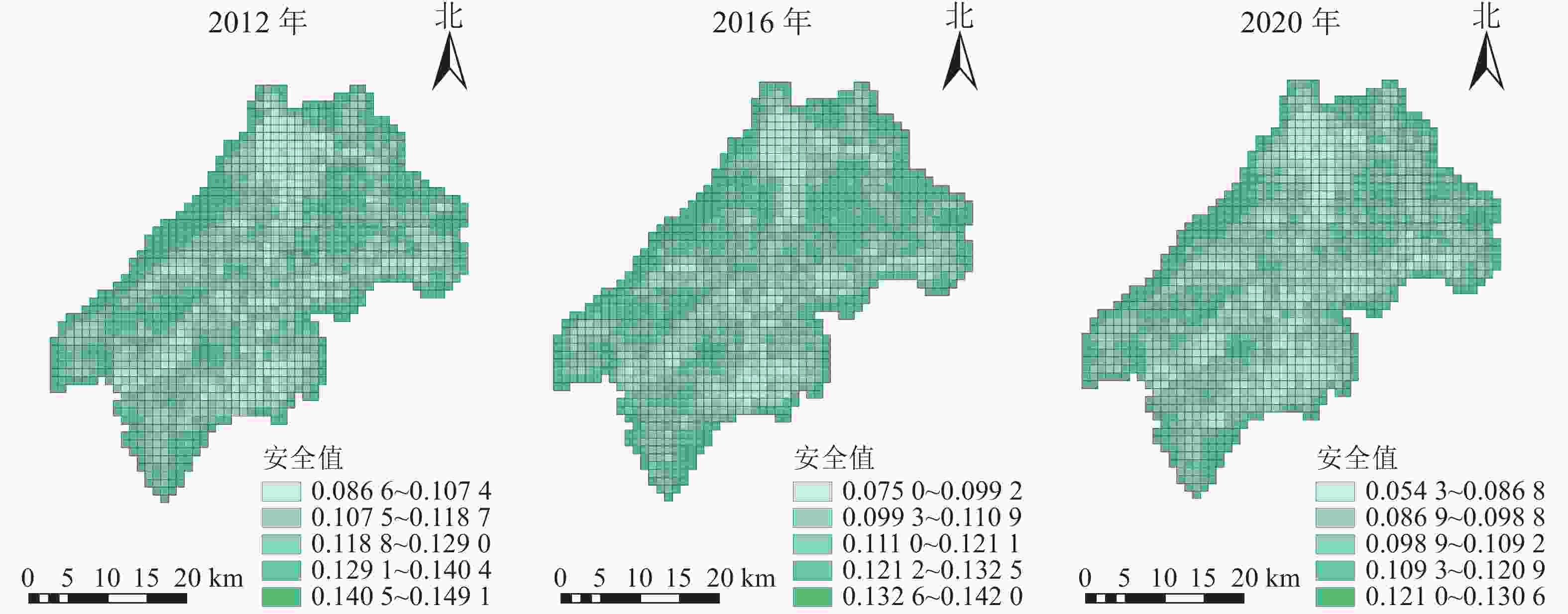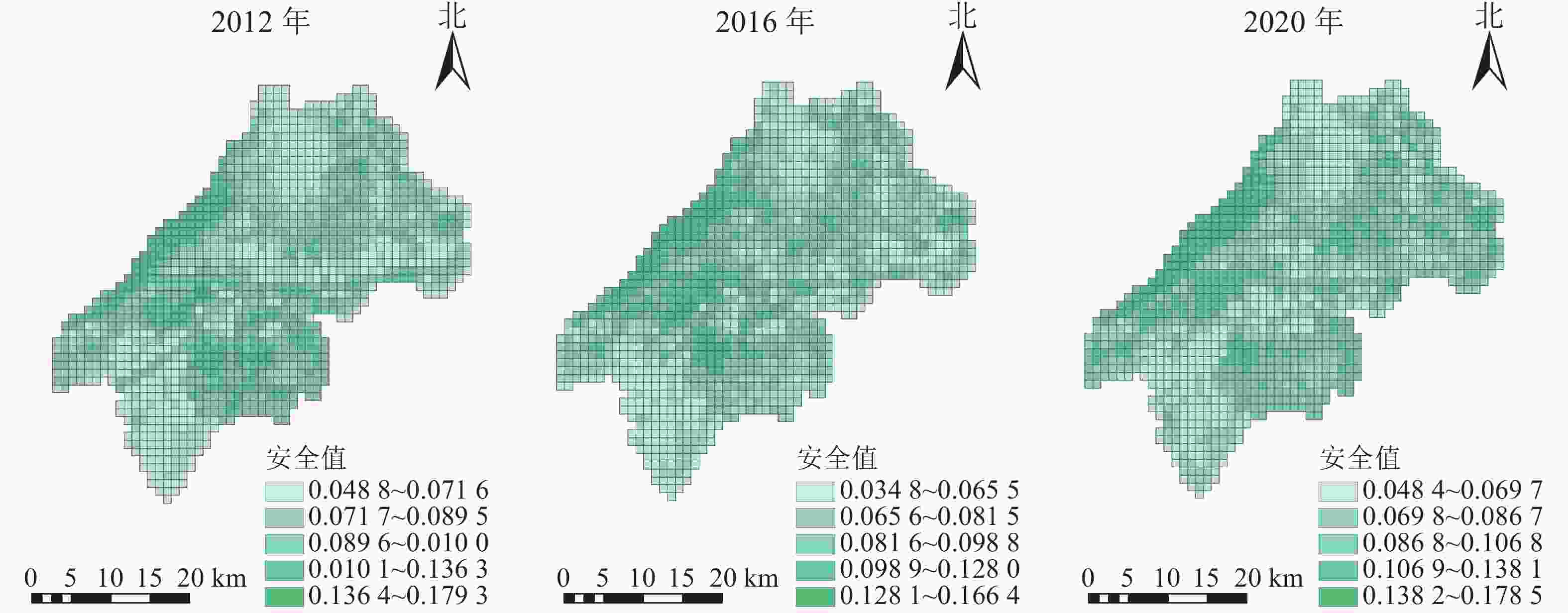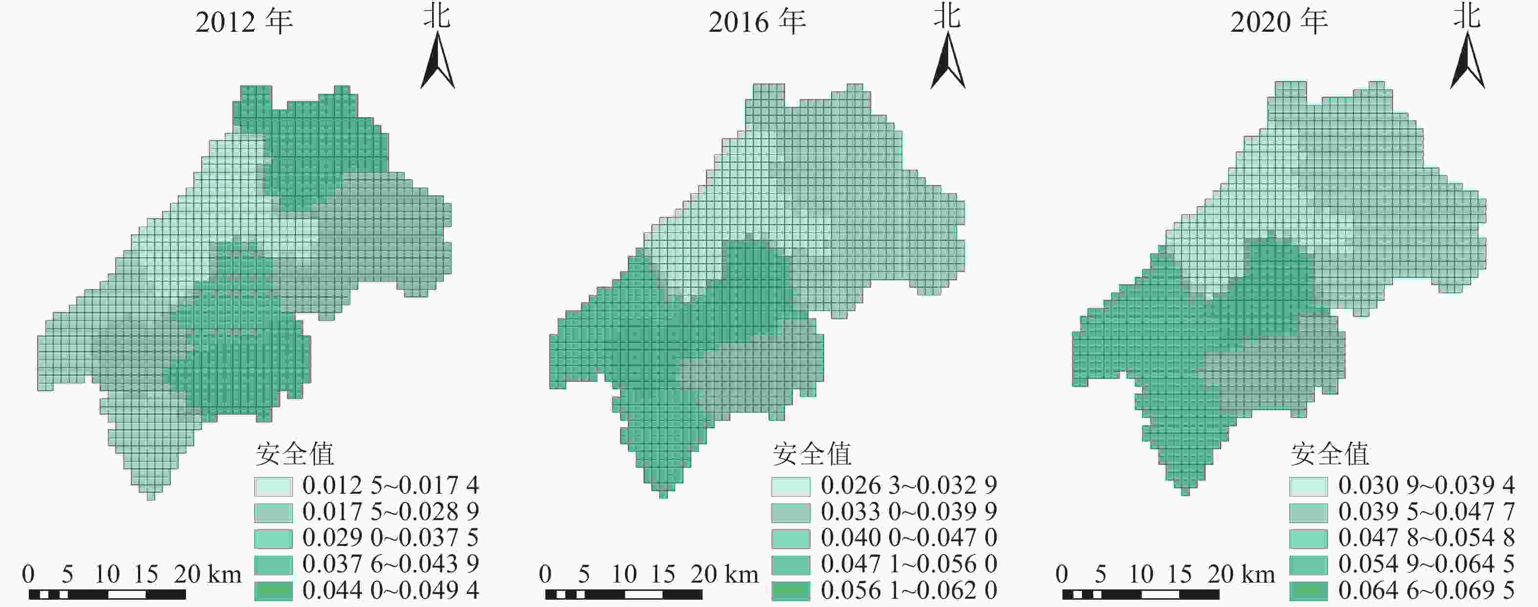 • 图3可知:驱动力子系统安全值由0.032 8增长至0.050 1,呈逐年升高的趋势,增长幅度平缓,说明驱动力子系统总体情况稳中向好。2012年驱动力安全值较高的区域集中于同里镇、盛泽镇和平望镇,2016年安全值高值区域主要位于平望镇、七都镇、震泽镇和桃源镇,2020年安全值高值分布与2016年分布相仿,原因在于上述几镇人口总数略有减少,对环境的压力有所降低,而由于吴江经济开发区的高速发展,使得同里镇的城市化快速提升,农业人口占比降低26%,GDP增长近7倍,同时也伴随着人口的急剧增长,仅2012—2016年,同里镇总人口数由4.3万增至10.4万,使得其驱动力安全值提升幅度相对较低。