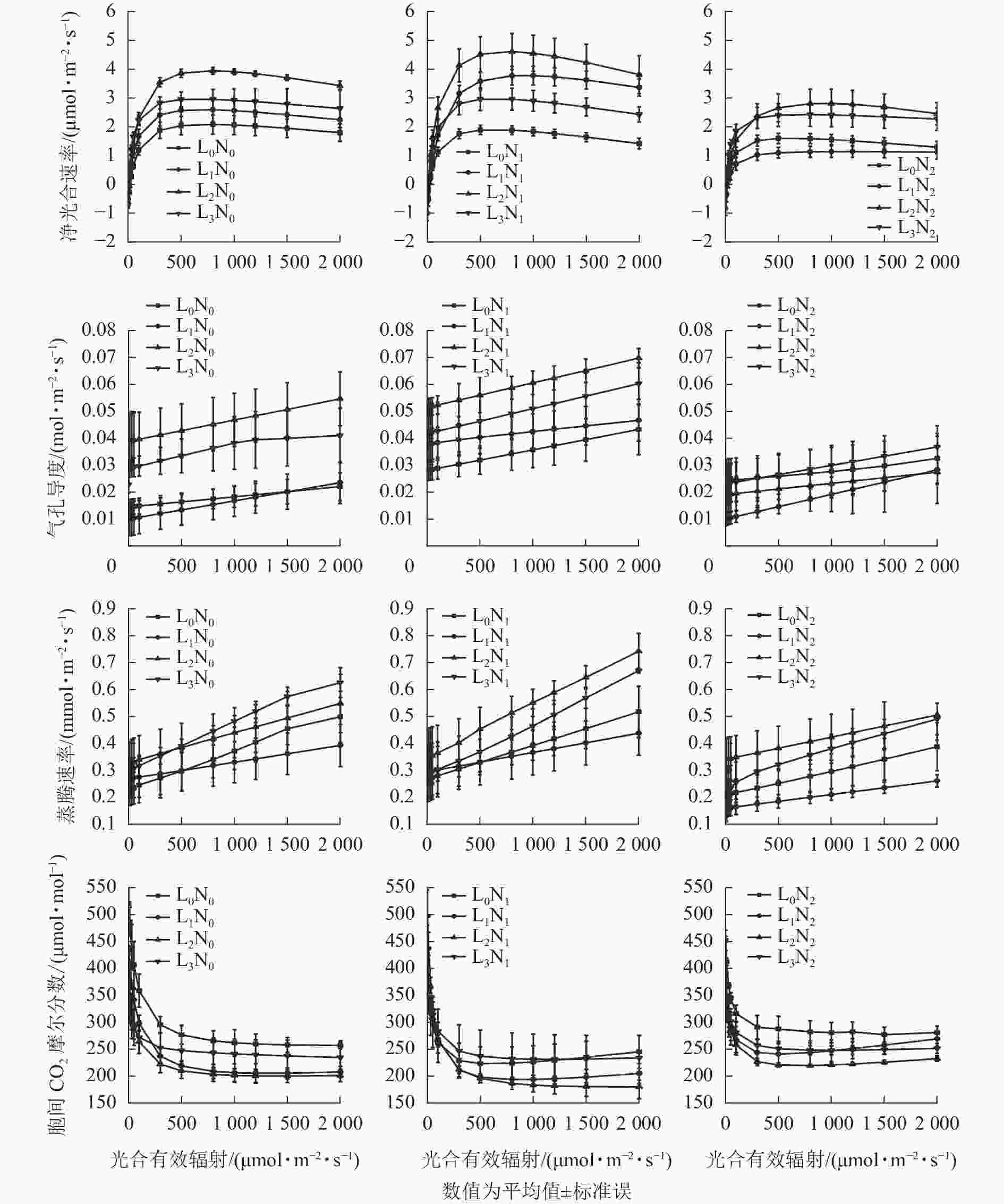 处理 Rd/(μmol·m−2·s−1) Pmax/(μmol·m−2·s−1) LSP/(μmol·m−2·s−1) LCP/(μmol·m−2·s−1) AQY/(μmol·mol−1) L0N0 0.69±0.08 ab 2.09±0.03 def 791.4±79.6 ab 20.0±0.7 abc 0.027±0.003 b L0N1 0.55±0.09 ab 1.92±0.15 def 717.7±103.1 ab 19.1±4.4 abc 0.031±0.006 b L0N2 0.34±0.12 b 1.54±0.17 ef 638.2±63.0 ab 9.5±2.2 bc 0.032±0.007 b L1N0 0.51±.0.09 b 2.61±0.42 cde 741.2±78.9 ab 10.5±1.3 bc 0.036±0.007 ab L1N1 1.00±.0.27 a 3.79±0.32 abc 931.4±66.3 a 23.6±5.6 ab 0.047±0.017 ab L1N2 0.72±0.35 ab 1.12±0.06 f 877.2±92.0 ab 26.0±17.3 a 0.034±0.014 ab L2N0 0.62±0.21 ab 3.95±0.12 ab 797.1±70.8 ab 11.9±4.4 abc 0.043±0.007 ab L2N1 0.52±0.13 ab 4.63±0.65 a 758.7±101.5 ab 8.3±2.0 bc 0.041±0.002 ab L2N2 0.52±0.11 ab 2.81±0.43 bcd 571.3±49.6 b 11.3±2.7 abc 0.032±0.002 b L3N0 0.30±0.08 b 2.93±0.26 bcd 778.0±185.8 ab 4.8±1.3 c 0.043±0.002 ab L3N1 0.49±0.15 b 3.01±0.18 bcd 699.4±98.1 ab 9.6±4.2 bc 0.048±0.005 ab L3N2 0.55±0.05 ab 2.56±0.48 cde 733.6±101.4 ab 8.3±1.3 bc 0.061±0.019 a 说明:数值为平均值±标准误,同一参数不同小写字母表示不同处理间差异显著(P<0.05) -