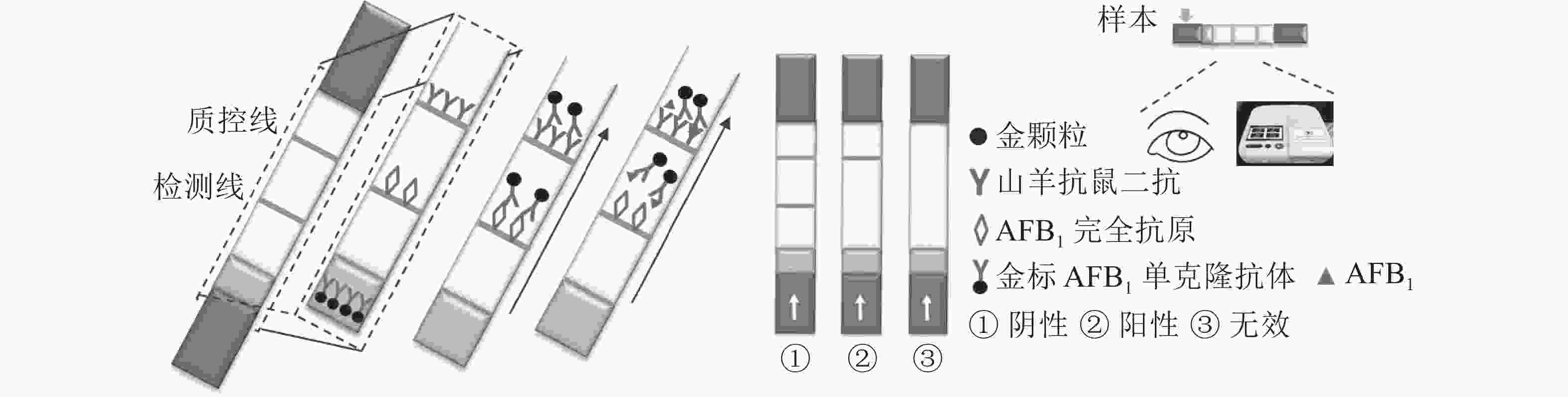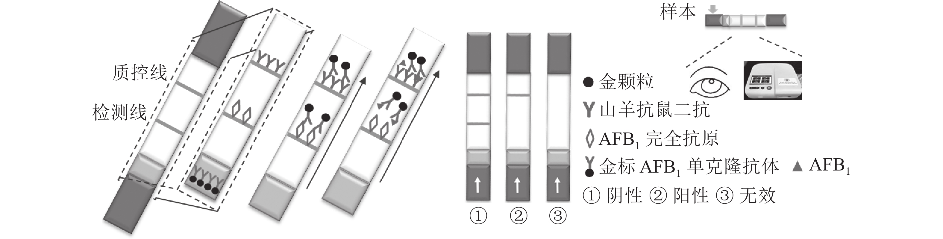 定性定量免疫层析检测法如图1所示。检测线包被AFB1完全抗原,质控线包被山羊抗鼠二抗,金颗粒标记的Anti-AFB1固定于金标垫。滴加待检样品,经层析作用后,可通过肉眼观察检测线与质控线颜色差异进行定性判定或经便携式信号读取仪检测线信号值进行定量分析。