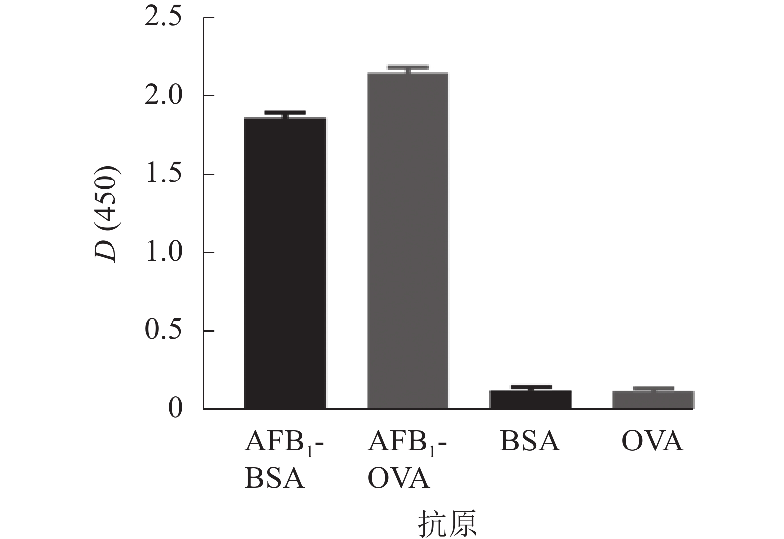 采用AFB1单克隆抗体对AFB1-BSA/OVA进行ELISA鉴定,结果如图3所示,完全抗原组D(450)与对照比值(BSA/OVA)远大于2.1,表明制备成功,可用于免疫学方法的建立。
