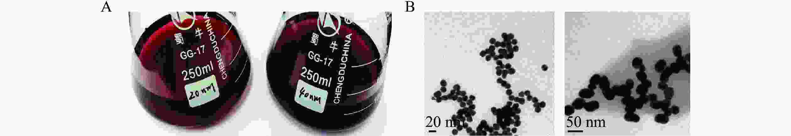 制备的金颗粒溶液颜色澄清鲜艳,40 nm金颗粒溶液颜色较20 nm深,无颗粒沉淀(图4A),透射电镜扫描结果显示颗粒粒径与预期相符,尺寸均匀(图4B),可用于后续抗体的标记。