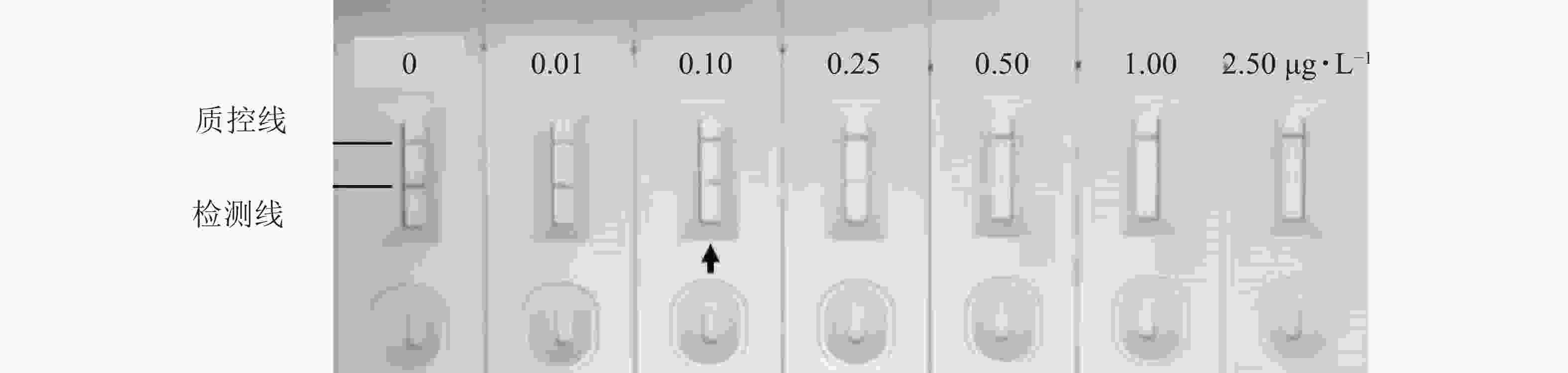为获得最佳的检测效果,对完全抗原包被质量浓度和金标抗体的使用质量浓度进行优化,最终确定AFB1-BSA的包被质量浓度为0.4 g·L−1,10倍稀释后的金标AFB1单克隆抗体喷涂量为20 μL·cm−2。