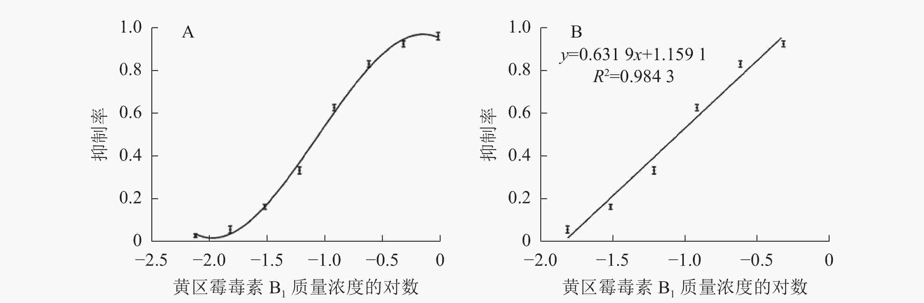选取不同载体蛋白(BSA和OVA)制备AFB1完全抗原。步骤:AFB1标准品(2 mg)溶解于甲醇-吡啶溶液(体积比1∶1),加入5 mg CMO震荡至完全溶解,70 ℃下搅拌活化2 h;活化产物自然干燥后,加入1 mL蒸馏水并使用氢氧化钠溶液(1 mol·L−1)调pH至8.0,为去除体系中未反应的AFB1,使用5 mL苯溶液抽提3次,pH调至3.0 (0.2 mol·L−1盐酸),产物经5 mL乙酸乙酯抽提3次后干燥得到AFB1肟化物AFB1O;所得AFB1O溶解于2 mL二甲基甲酰胺(DMF),分别加入DCC (8.9 mg)和NHS (5.0 mg)室温搅拌活化4 h;BSA (14.0 mg)或OVA (9.3 mg)溶解于1 mL碳酸氢钠溶液(0.1 mol·L−1,pH 9.5),将上一步所得的AFB1O活化产物缓慢滴加至载体蛋白溶液,室温混匀反应2 h;反应结束后在磷酸盐缓冲液(0.01 mol·L−1,pH 7.4)中4 ℃透析72 h,每12 h换液,产物即为AFB1完全抗原,经酶联免疫检测法(ELISA)鉴定后保存备用。
