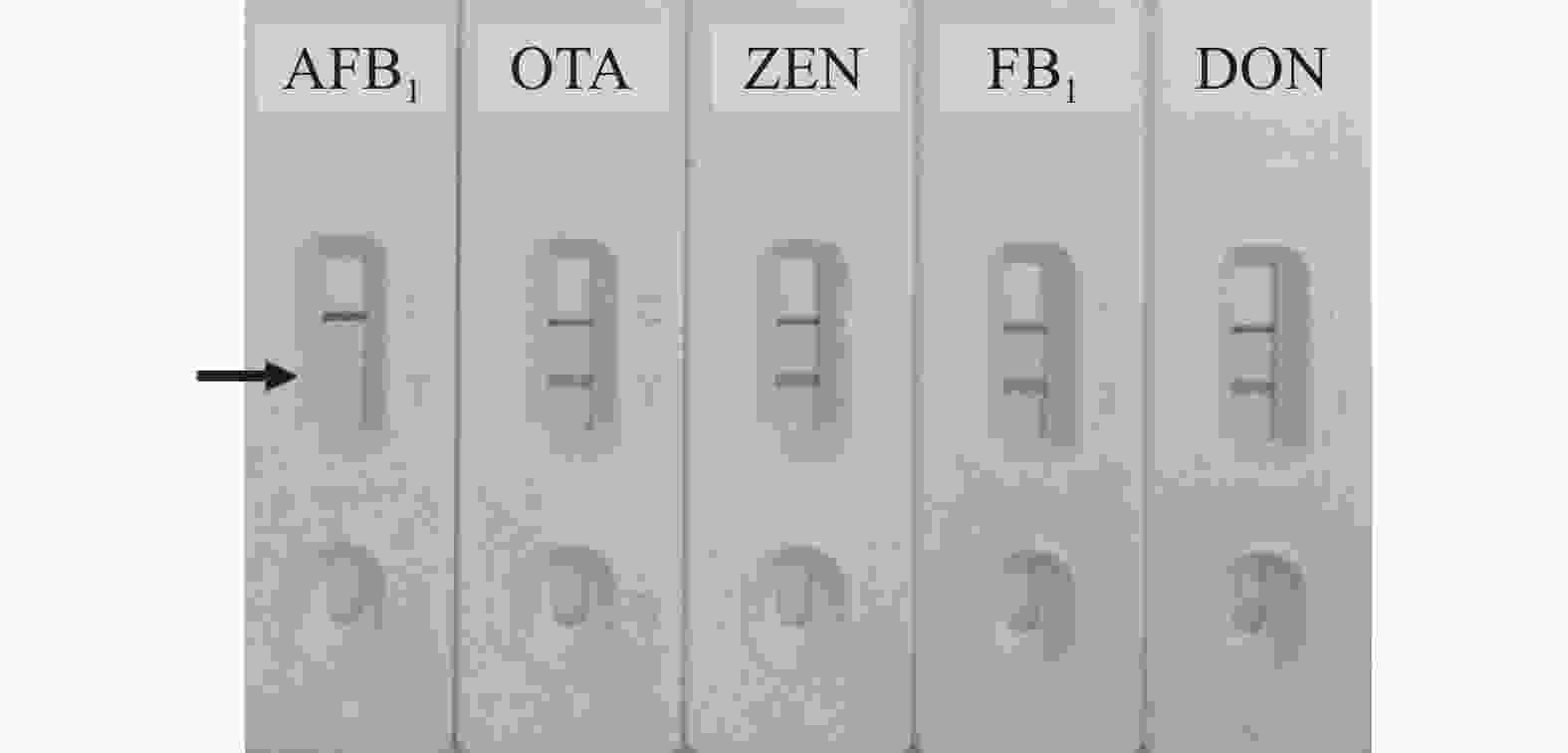 以谷物类样本中其他常见真菌毒素如赭曲霉毒素A(OTA)、玉米赤霉烯酮(ZEN)、伏马毒素B1(FB1)和呕吐毒素(DON)作为竞争抗原,进行特异性验证,结果如图7所示,建立的免疫层析检测法对上述毒素均不存在交叉反应,特异性较好,质量浓度均为5.00 μg·L−1。