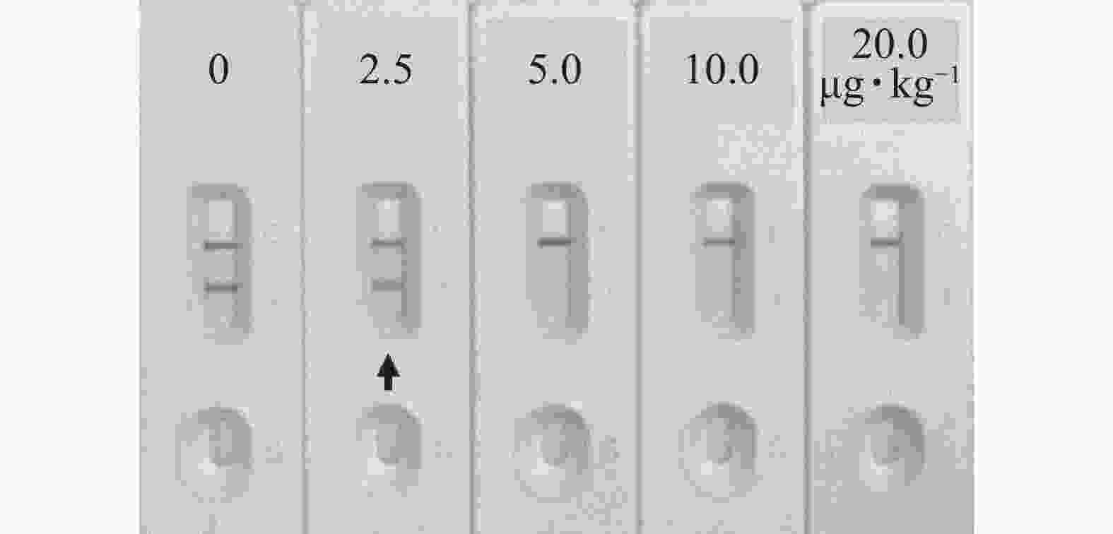 如图8所示:对玉米Zea mays样本进行加标试验,当AFB1加标质量分数为2.5 μg·kg−1可使检测线变化明显,说明该免疫层析检测法在实际样本中的定性检测限为2.5 μg·kg−1。