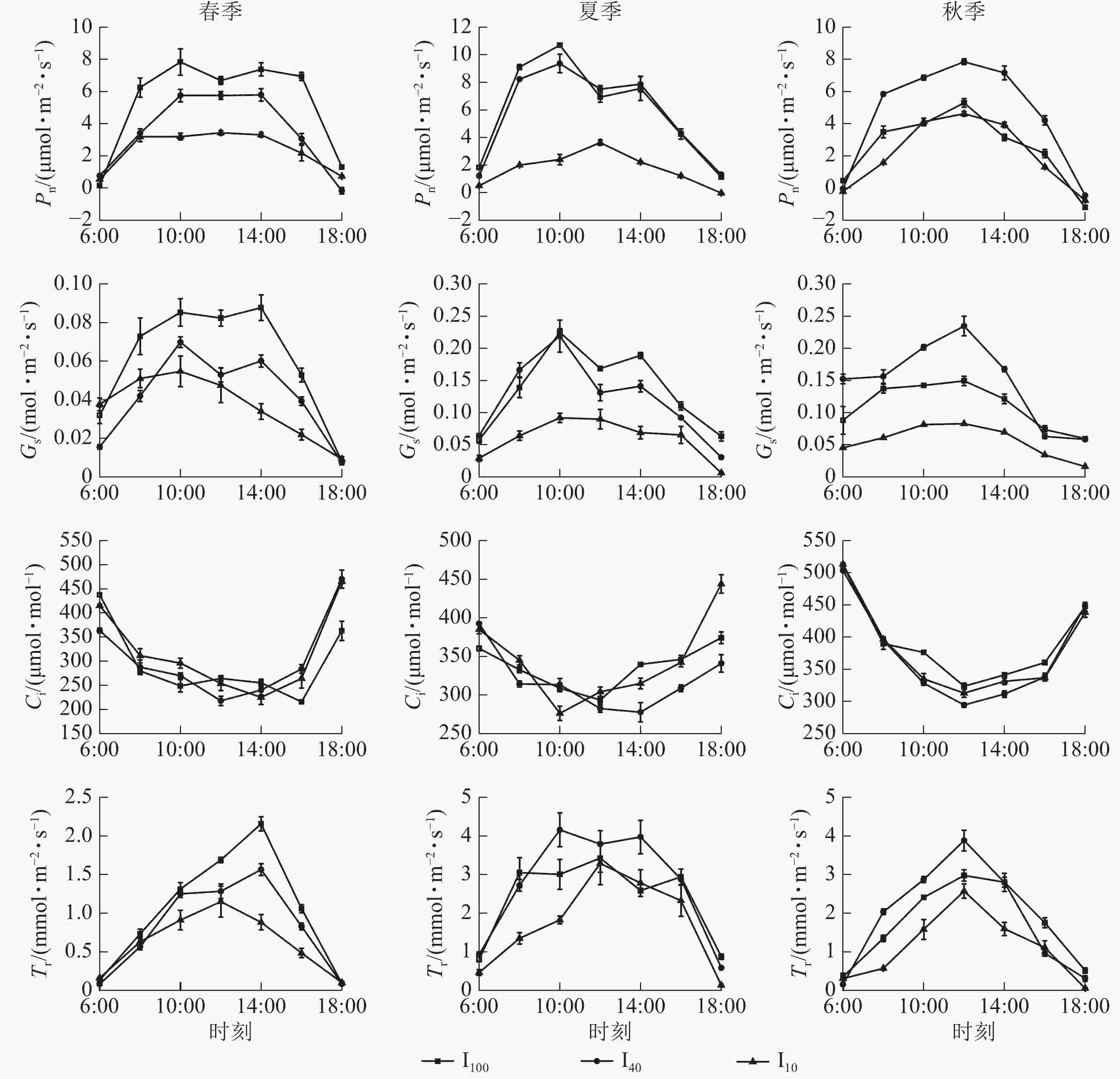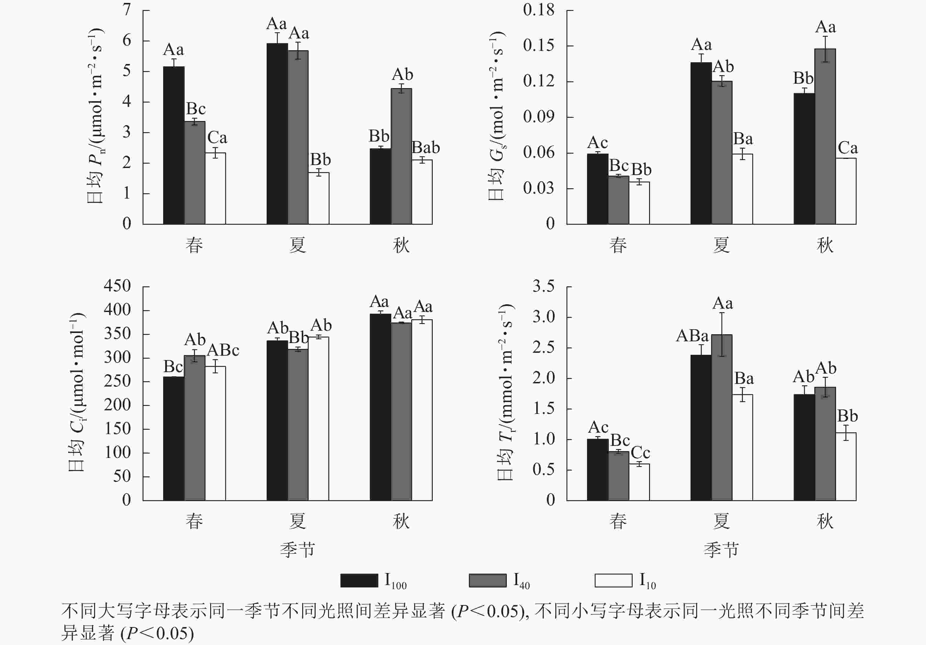 春季、夏季100%全光照(I100)以及夏季40%全光照(I40)下景宁木兰幼苗净光合速率(Pn)日变化均呈“双峰”曲线,第1峰值出现在10:00,在12:00时到达波谷,14:00时出现第2峰值,具有“光合午休”现象,其余Pn日变化均为“单峰”曲线,峰值均在12:00(图1)。春季日均Pn从大到小依次为100%全光照、40%全光照、10%全光照,均达到差异显著水平(P<0.05);夏季10%全光照的日均Pn显著低于100%全光照、40%全光照(P<0.05);秋季40%全光照的日均Pn显著高于100%全光照、10%全光照(P<0.05)(图2)。100%全光照下秋季的日均Pn显著低于春季、夏季(P<0.05);40%全光照下的日均Pn从大到小依次为夏季、秋季、春季,均差异显著(P<0.05);10%全光照下的日均Pn为春季显著高于夏季(P<0.05) (图2)。