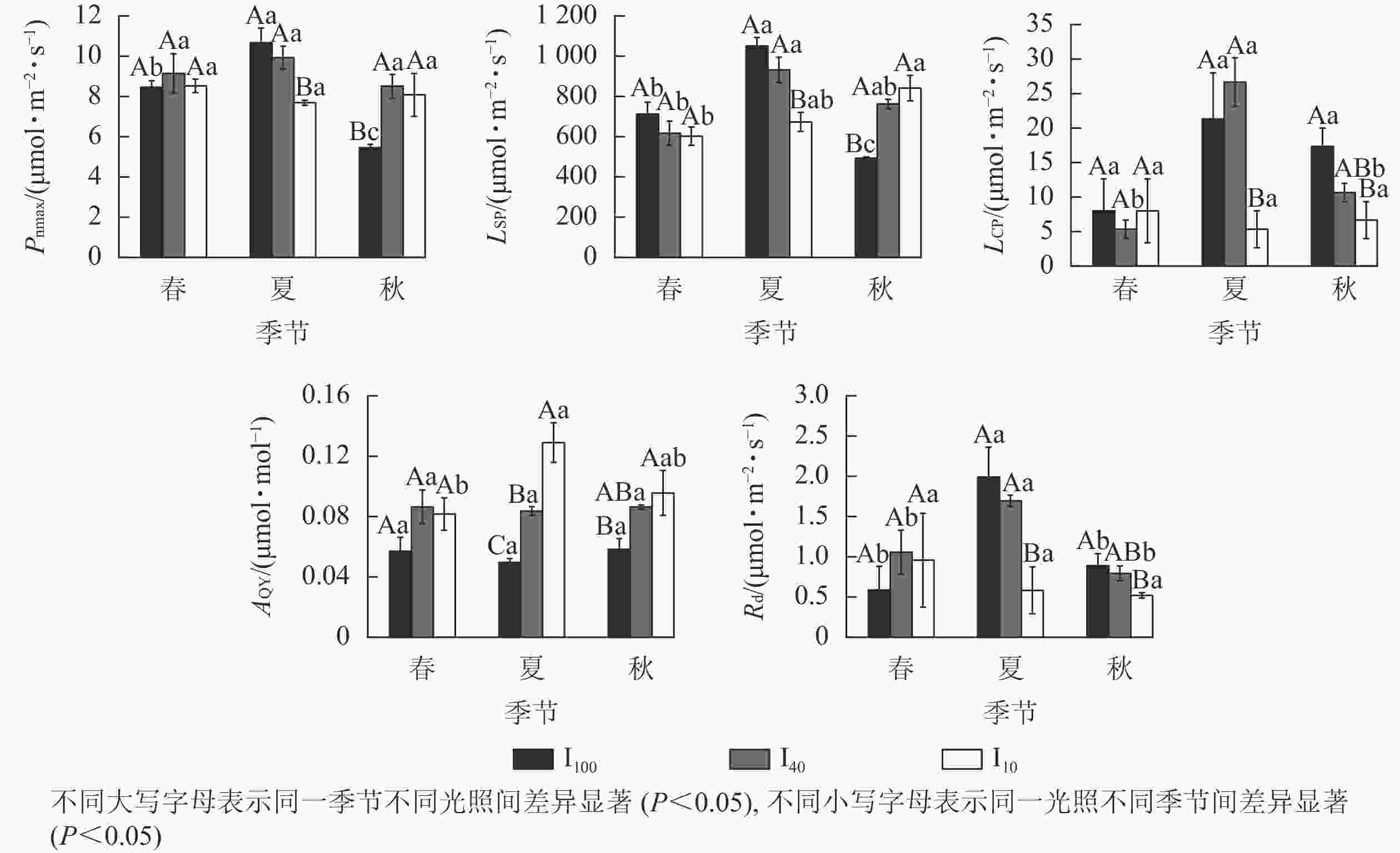 从图3可见:夏季10%全光照下的最大净光合速率(Pnmax)、光饱和点(LSP)、光补偿点(LCP)、暗呼吸速率(Rd)均显著小于100%全光照、40%全光照(P<0.05),而表观量子效率(AQY)随着光照强度增加不断下降,3个处理间差异显著(P<0.05)。秋季遮光处理下Pnmax、LSP显著高于100%全光照(P<0.05);100%全光照下LCP、Rd显著大于10%全光照(P<0.05);10%全光照AQY显著大于100%全光照(P<0.05)。100%全光照下Pnmax、LSP从大到小依次为夏季、春季、秋季,均差异显著(P<0.05)。40%全光照下LSP在夏季显著高于春季(P<0.05);夏季LCP、Rd显著高于春季、秋季(P<0.05)。10%全光照下秋季LSP显著高于春季,夏季AQY显著高于春季(P<0.05)。