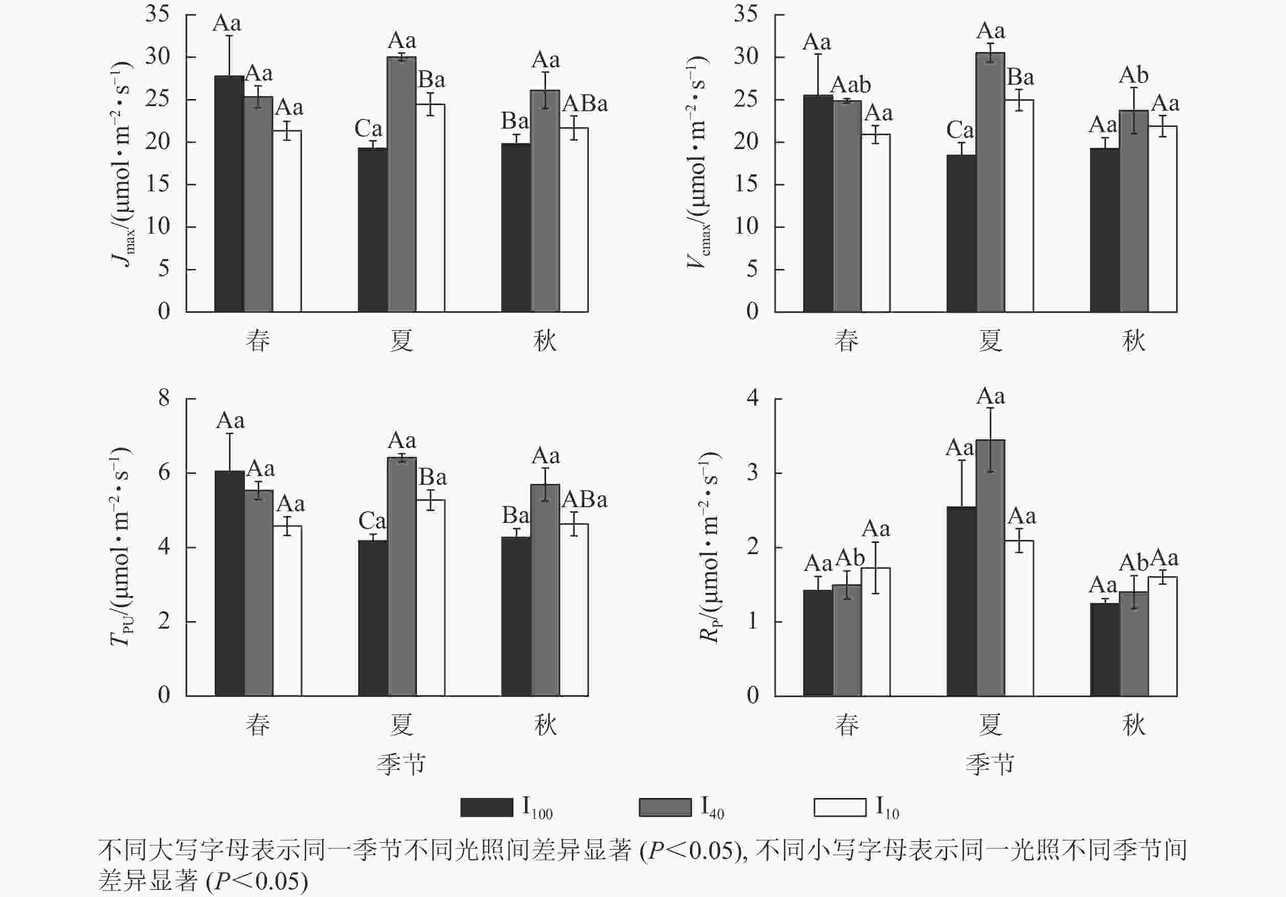 夏季景宁木兰幼苗叶片的最大电子传递速率(Jmax)、最大羧化速率(Vcmax)、磷酸丙糖利用率(TPU)从大到小依次为40%全光照、10%全光照、100%全光照,均差异显著(P<0.05)(图4)。秋季40%全光照下的Jmax和TPU均显著高于100%全光照(P<0.05)。夏季40%全光照下的Vcmax显著高于秋季,光呼吸速率(Rp)显著高于春季、秋季(P<0.05)。