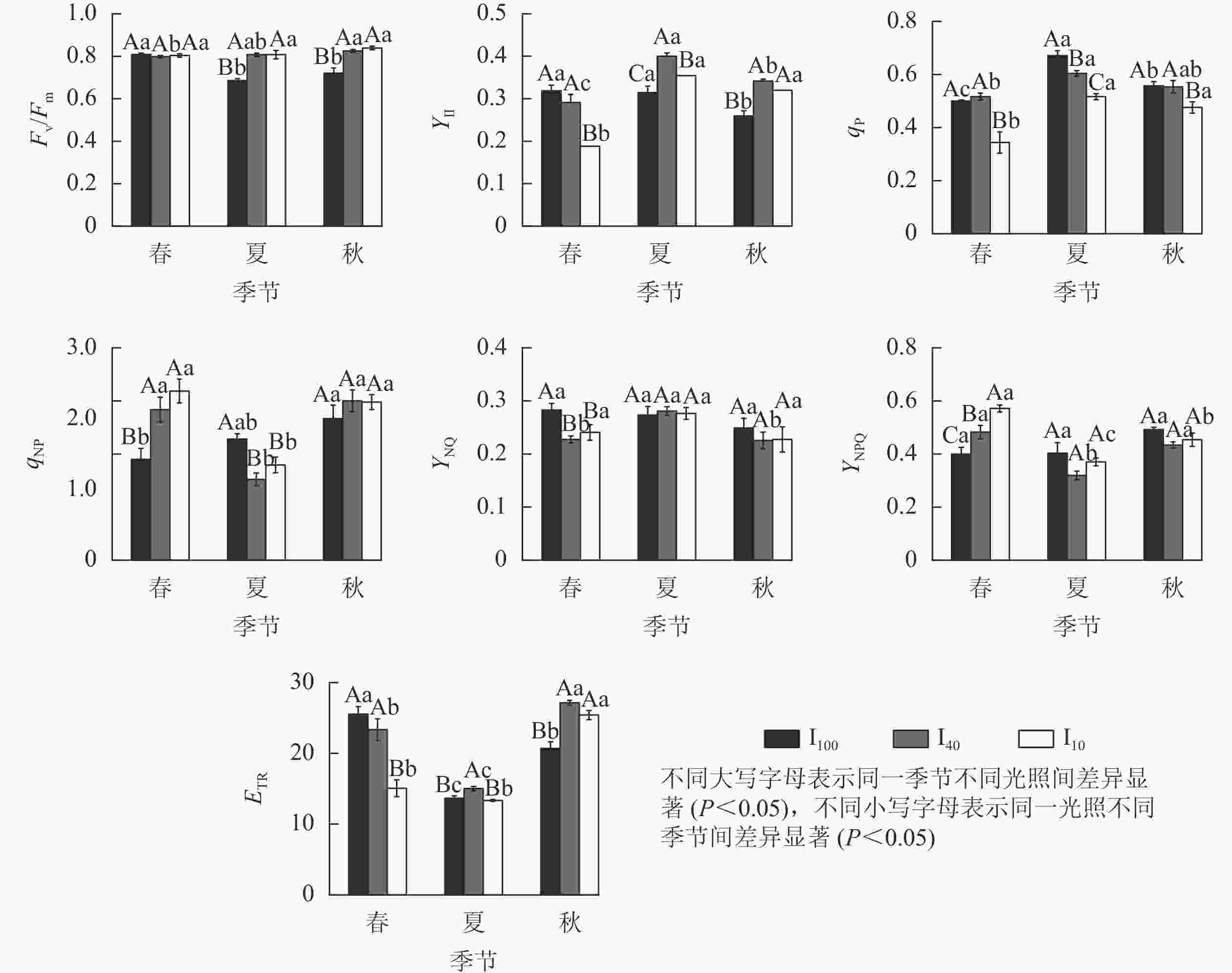 100%全光照下,景宁木兰幼苗叶片的Fv/Fm在春季显著高于夏季、秋季(P<0.05);YⅡ在秋季则显著低于春季、夏季(P<0.05);qP从大到小依次为夏季、秋季、春季,均差异显著(P<0.05);qNP在秋季显著高于春季(P<0.05);ETR从大到小依次为春季、秋季、夏季,均差异显著(P<0.05)。40%全光照下,秋季的Fv/Fm显著高于春季(P<0.05);YⅡ从大到小依次为夏季、秋季、春季,均差异显著(P<0.05);qP在夏季显著高于春季(P<0.05);qNP在夏季显著低于春季、秋季(P<0.05);YNO在夏季显著高于春季和秋季(P<0.05);YNPQ在夏季显著低于春季和秋季(P<0.05);ETR从大到小依次为秋季、春季、夏季,均差异显著(P<0.05)。10%全光照下春季YⅡ、qP均显著低于夏季和秋季(P<0.05);qNP在夏季显著低于春季、秋季(P<0.05);YNPQ从大到小依次为春季、秋季、夏季,均差异显著(P<0.05);秋季的ETR显著高于春季、夏季(P<0.05)。