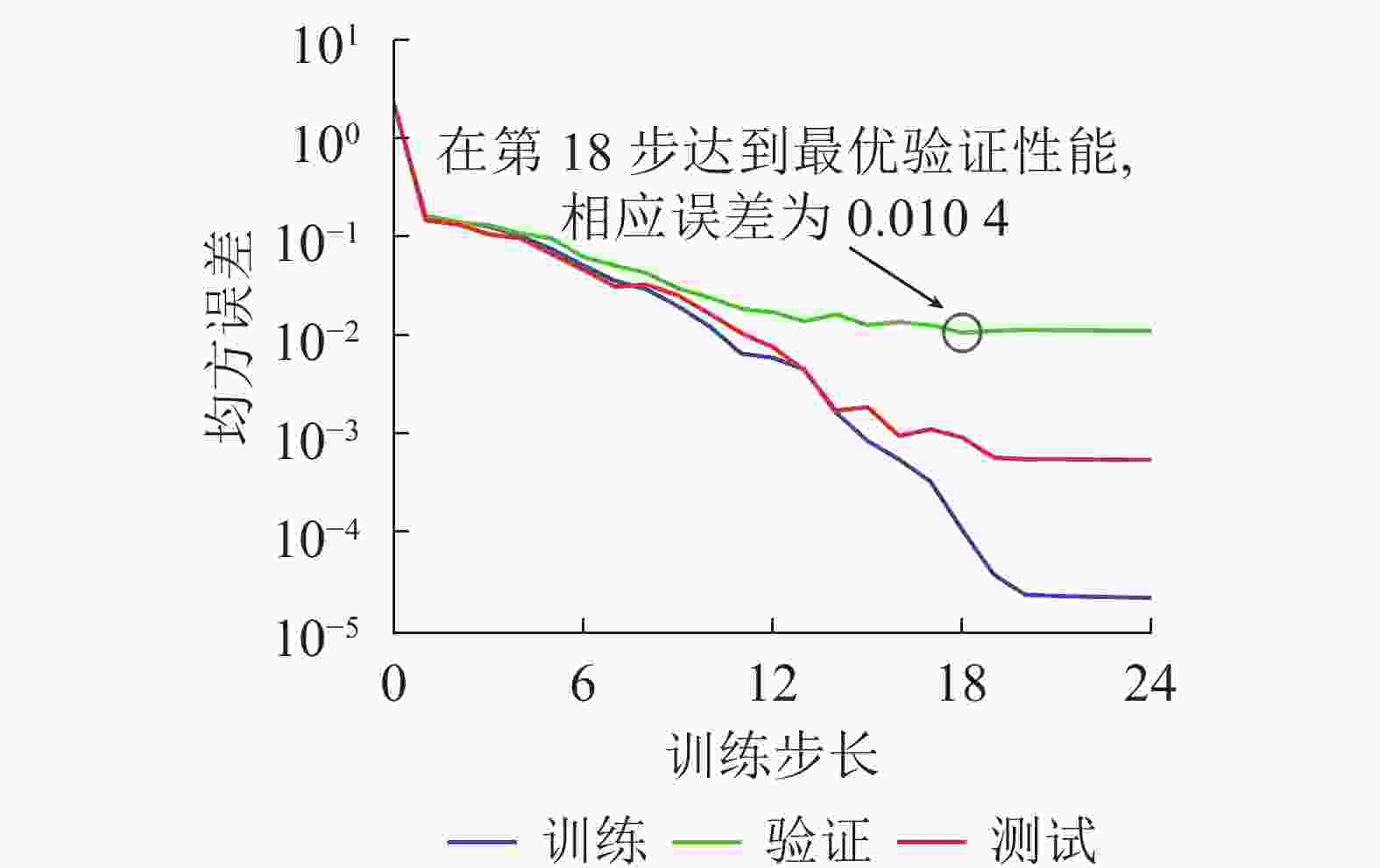 训练及验证样本从样本数据中随机选取,且无交集。用于训练、验证及测试的样本数分别为608、131及131个。图2为神经网络EMS的曲线图。由图2可知:当训练步数增加时,模型误差曲线逐渐逼近误差的最优值。当模型迭代18次时,验证误差达到0.0104,网络训练稳定且迅速收敛,说明该模型能够满足需求。