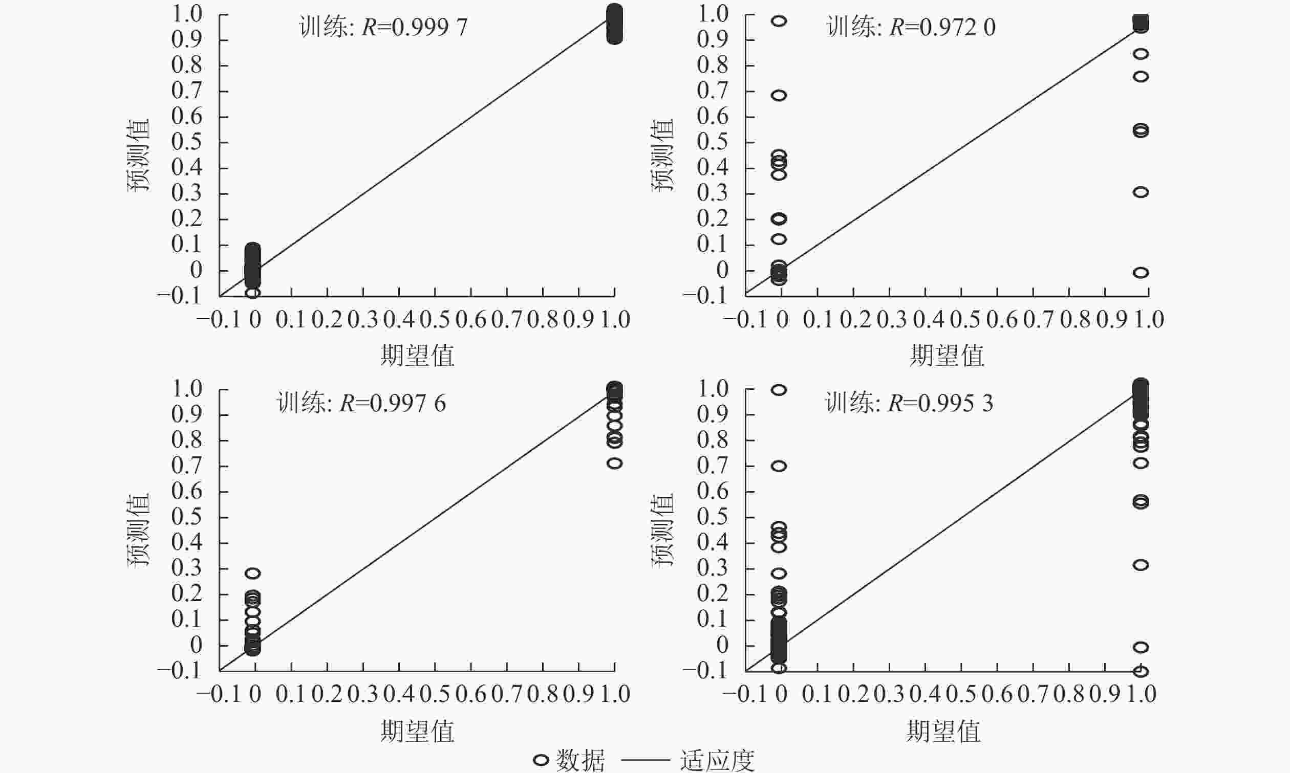 基于MATLAB R2019b工具箱nftool环境设计了1个3层BP神经网络,将归一化后的指标数据及评价结果类别分别作为输入层及输出层。根据经验公式[20],计算隐含层单元数,后通过试错法[21]对比,确定最终隐含层数量。采用均方误差(EMS)与相关系数(R)对模型性能进行评估[23]。