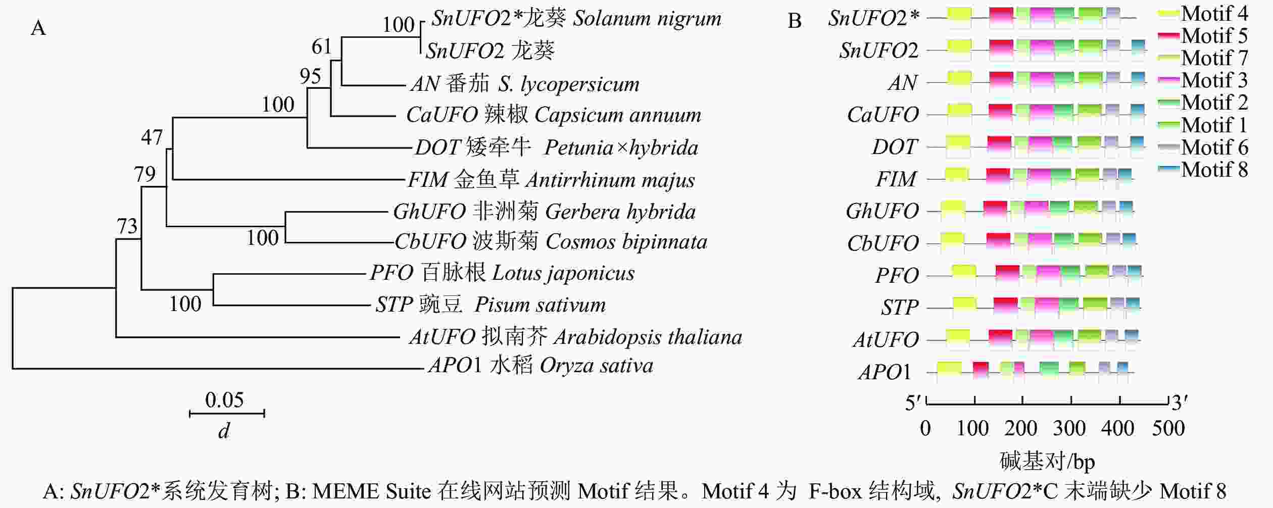 • 以野生型龙葵盛花期花苞的cDNA为模板,克隆得到2条SnUFO2序列,都含有F-box结构域。一条序列与转录组测序结果一致,为龙葵中SnUFO2基因,编码456个氨基酸;另一条序列为短截版的SnUFO2基因,该基因在1 294~1 295 bp处有1个碱基G的插入,导致翻译提前终止,编码433个氨基酸,记为SnUFO2*。将SnUFO2*基因、全长SnUFO2基因和不同物种中UFO的同源基因构建系统进化树。SnUFO2*、SnUFO2基因和番茄、辣椒Capsicum annuum和矮牵牛Petunia × hybrida中的UFO基因在同一进化分支,同源关系较近,而与水稻Oryza sativa,拟南芥中的UFO基因同源关系较远(图1A)。
