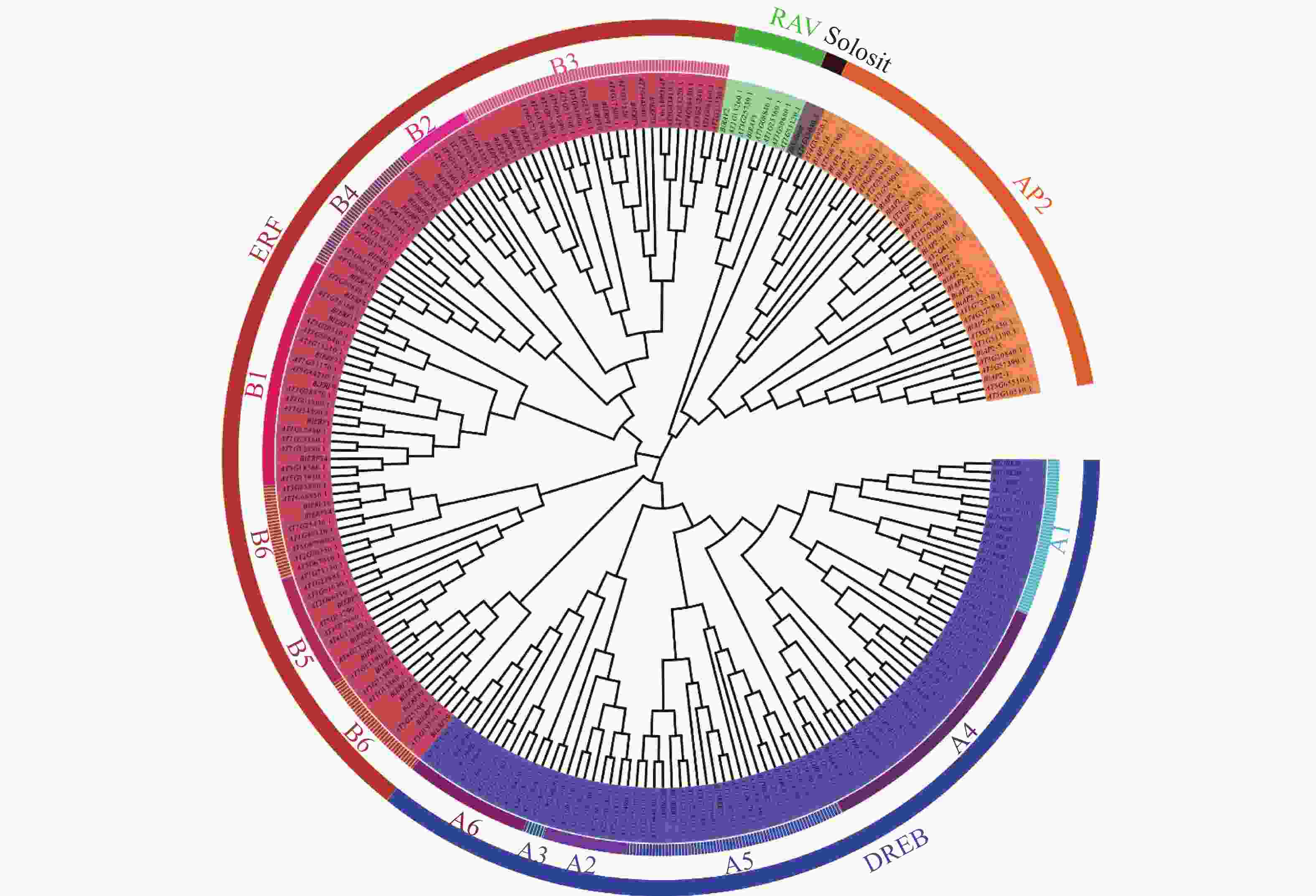 • AP2/ERF基因家族是植物最大的转录因子家族之一,广泛参与植物生长发育和逆境胁迫响应等生物学过程,在植物遗传改良与育种方面具有重要应用价值[1-2]。AP2/ERF转录因子家族成员通常含有1~2个高度保守的AP2结构域,AP2结构域由60~70个氨基酸组成,构成典型的螺旋-转角-螺旋结构,通过特异性结合DNA以调节靶基因表达[3-4]。根据AP2结构域数量和特征序列,AP2/ERF基因家族可分为AP2、ERF、DREB、RAV和Soloist等5个亚家族[5]。一般来讲,AP2亚家族成员具有2个AP2结构域,在调控植物发育方面具有重要功能[6]。ERF、DREB和RAV亚家族成员则仅具有1个AP2结构域,其中RAV亚家族成员还具有1个B3结构域[7]。此外,其他具有特殊基因结构和类似AP2结构域的成员则属于Soloist亚家族[8]