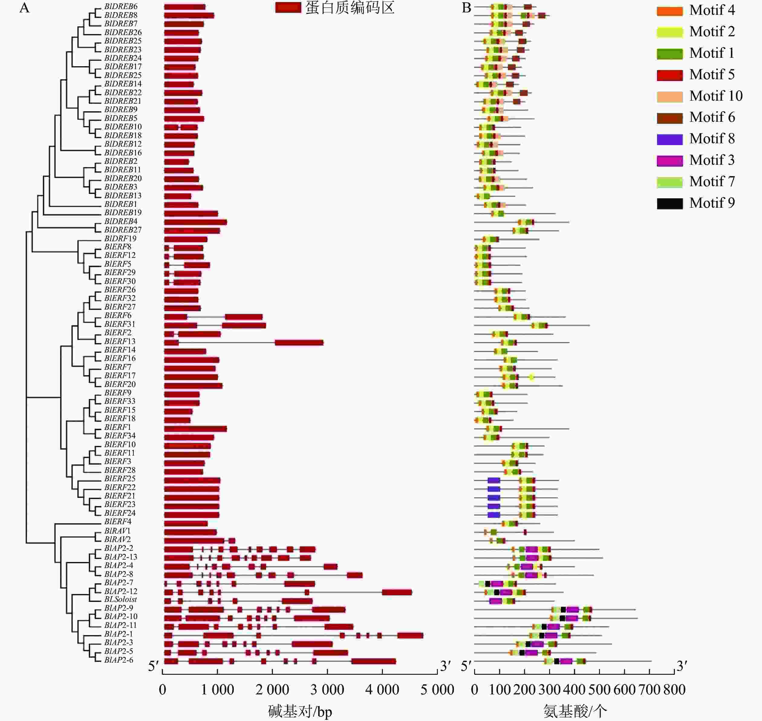 图 2光皮桦AP2 /ERF家族基因成员结构(A)及保守基序(B)