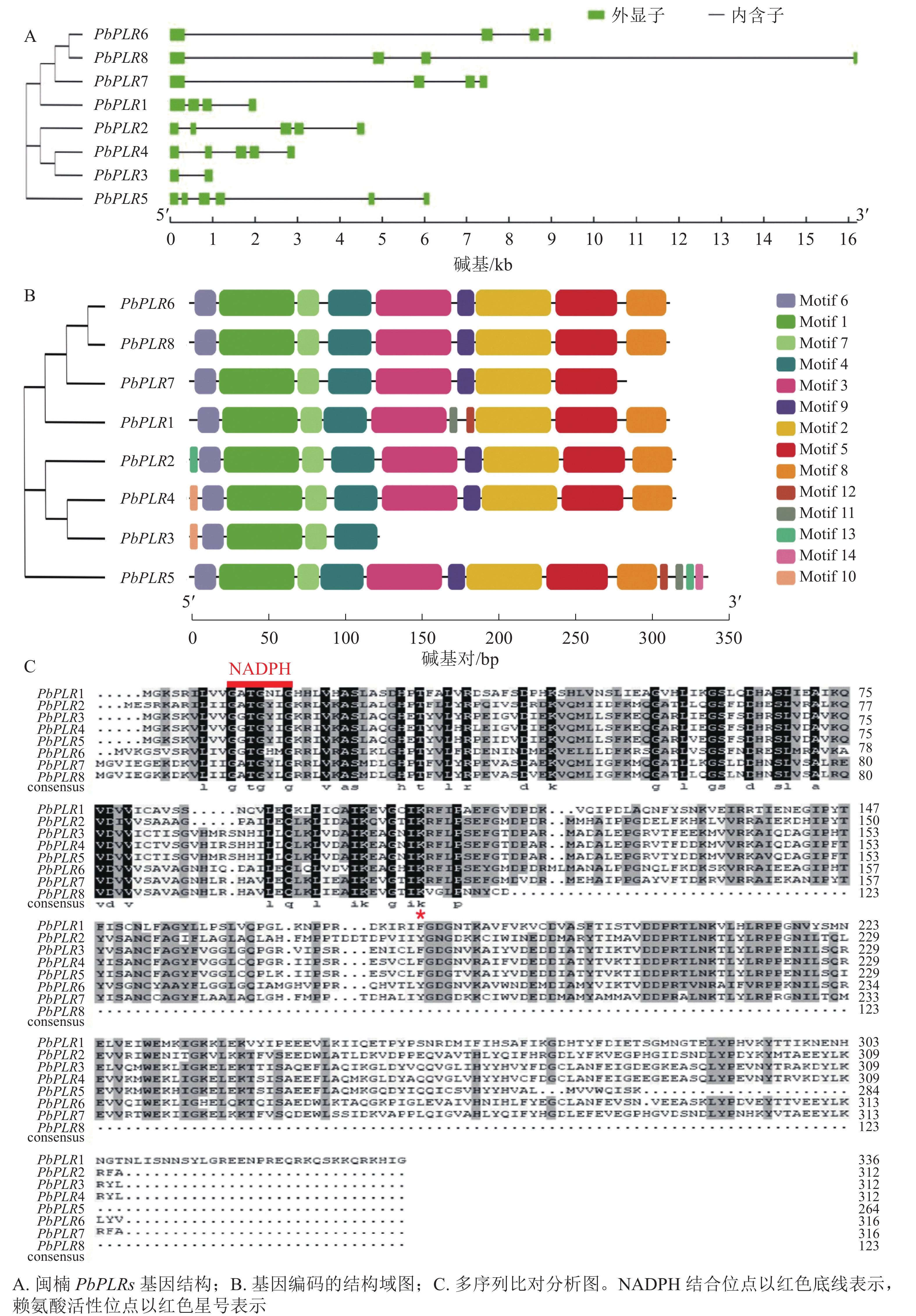 对PbPLR蛋白序列进行保守基序(Motif)分析,共检测到14个保守基序(图1B)。多序列比对分析发现:PbPLRs都具有保守的NADPH结合位点和赖氨酸(Lys)活性位点(图1C),PbPLR1含有特异Motif 11、Motif 13和Motif 14;PbPLR 6和PbPLR 8含有特有的Motif 10。