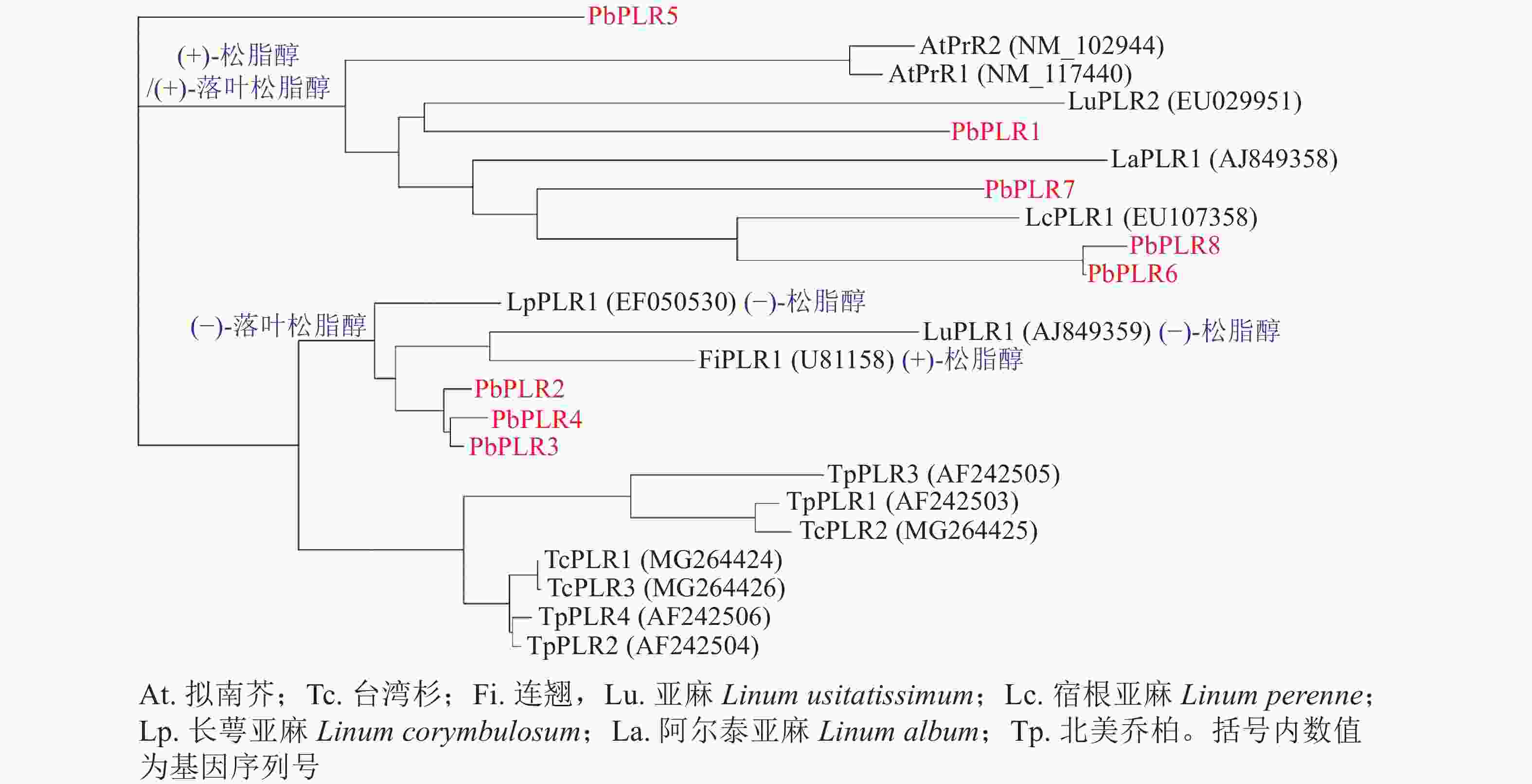 • 为研究PbPLRs家族的进化关系并预测其催化酶功能,选取裸子植物台湾杉、北美乔柏,以及被子植物拟南芥、连翘和亚麻等物种的PLR蛋白序列构建系统进化树(图2)。系统进化分析表明:裸子植物的台湾杉TcPLRs和北美乔柏TpPLRs属同一分支,即裸子植物和被子植物PLRs不论其底物立体选择性如何,均可分为2分支群[17-20]。然而,被子植物PLRs根据其底物立体选择性而分属不同支群,根据位于同一分支的LcPLR1、LaPLR1和LuPLR2的底物偏好,推测PbPLR1、PbPLR6、PbPLR7和PbPLR8偏好(+)-松脂醇[(+)-pinoresinol]和(+)-落叶松脂醇[(+)-lariciresinol];而PbPLR2、PbPLR3和PbPLR4同属于一个小分支,与偏好(−)-松脂醇和(−)-落叶松脂醇的LuPLR1和偏好(+)-松脂醇和(−)-落叶松脂醇的LpPLR1亲缘关系较近,推测PbPLR2、PbPLR3和PbPLR4可将(−)-松脂醇还原为(−)-落叶松脂醇。PbPLR5与其他PLR成员亲缘关系较远,不能预测其选择性。