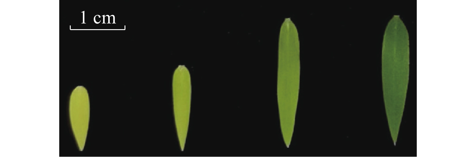 不同着色程度毛竹叶片采集:选取长势良好且一致的毛竹实生幼苗,待其在暗培养箱里长到三叶一心时,取黄色叶片的幼苗,并将其中3盆转移到光照培养箱中;培养第2天取淡黄色叶片;培养第4天,取淡绿色叶片;培养第6天,取绿色的叶片(图1)。每个类型的叶片取3张,进行液氮速冻,存于−80 ℃冰箱,用于RNA提取。