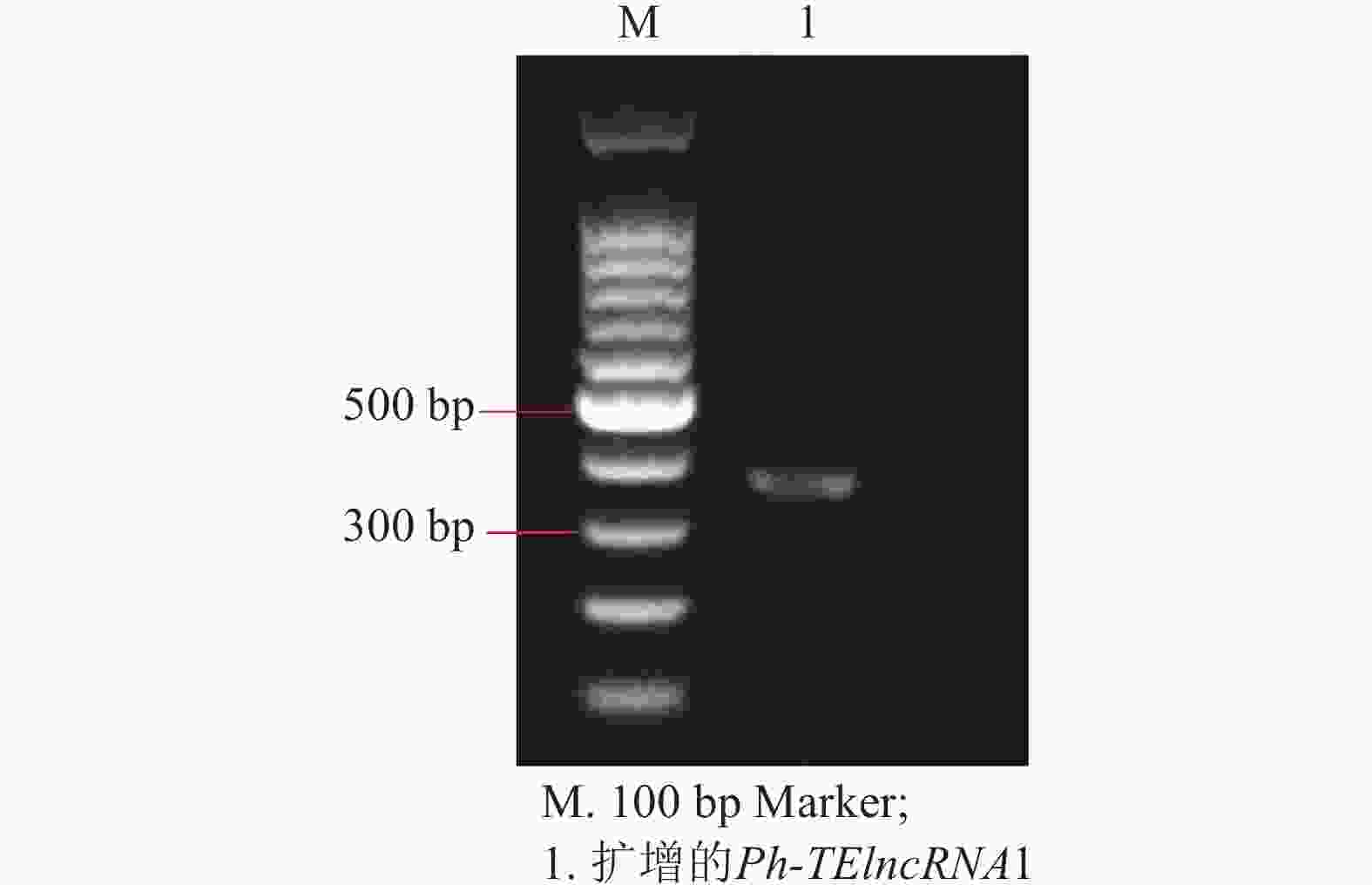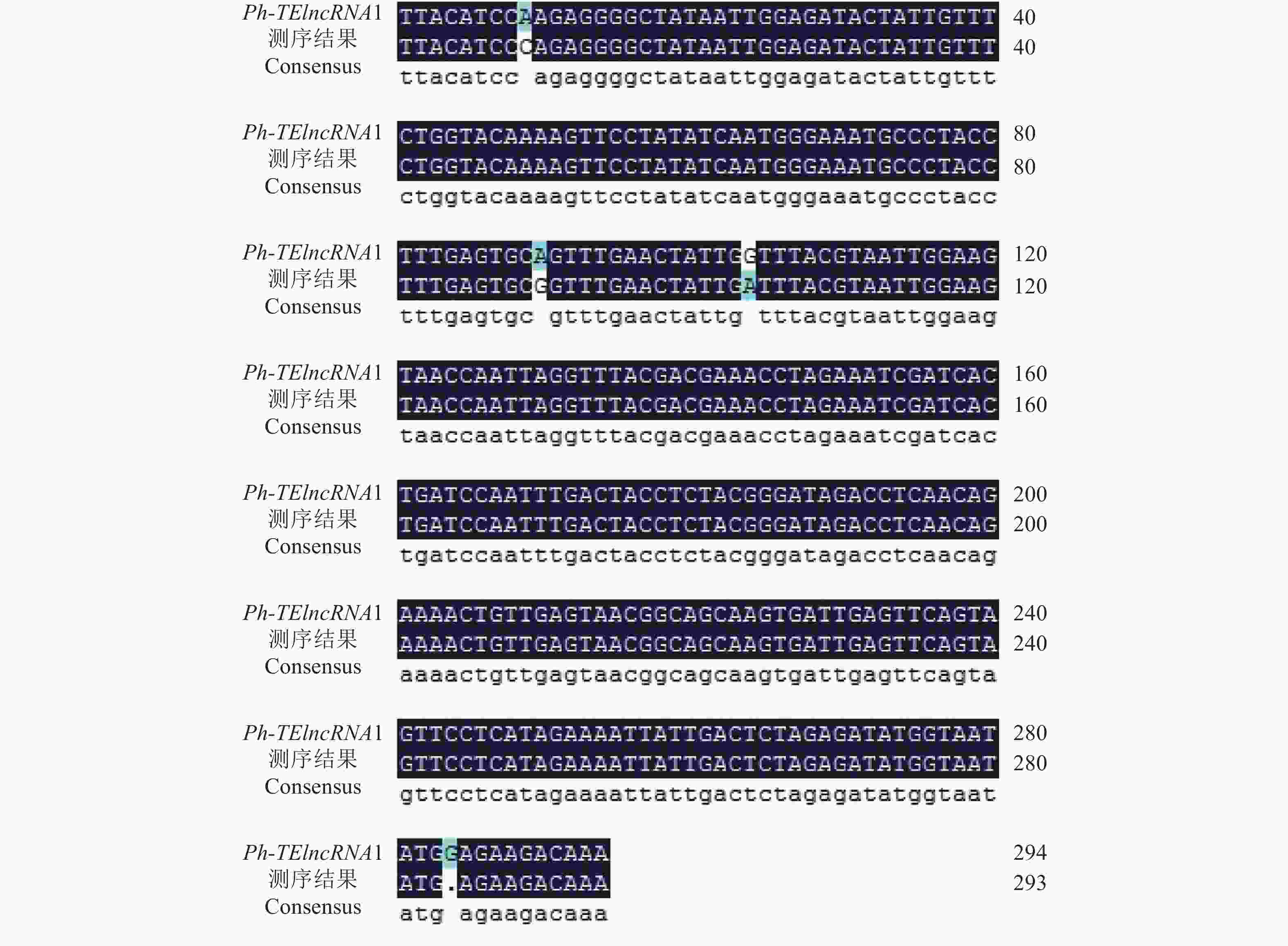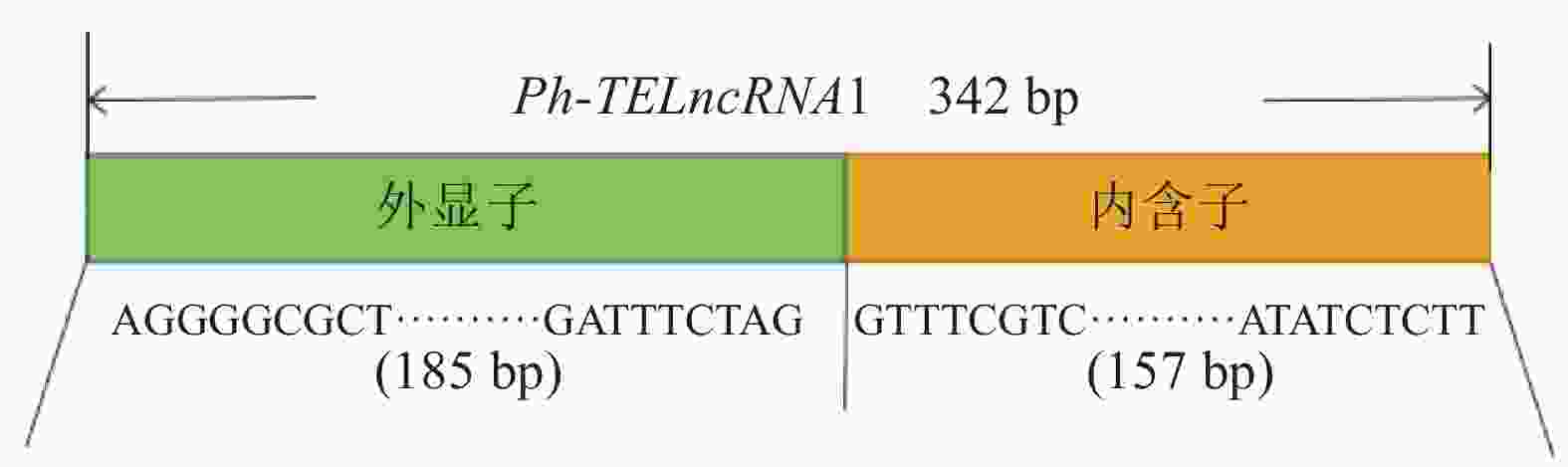 分析表明:该lncRNA 位于一个反转录转座子大片段(large retrotransposons derivatives, LARD)内部(图2),为转座子来源的lncRNA,命名为Ph-TElncRNA1。Ph-TElncRNA1全长为 342 bp,其中 185 个碱基来源于外显子,157 个碱基来源于内含子(图3)。