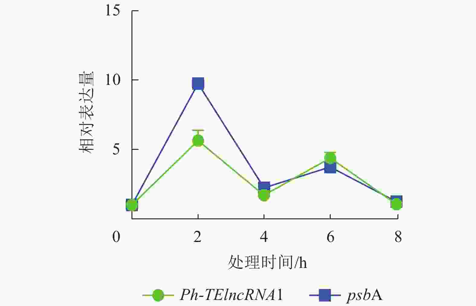 通过实时荧光定量 PCR 验证,发现 PH01002523G0060 和PH01002523G0050 在紫外胁迫处理 2、4、6、8 h 后,相对表达量的趋势杂乱,与Ph-TElncRNA1不一致,说明 PH01002523G0060 和 PH01002523G0050 这2个靶基因与Ph-TElncRNA1的关联性不强,从而剔除掉。最终得到靶基因 PH01002523G0140 与Ph-TElncRNA1关联性较强,且相对表达量呈现完全一致的趋势。靶基因 PH01002523G0140 是psbA同源基因,编码 photosystem Ⅱ protein D1。与对照相比,Ph-TElncRNA1和靶基因psbA的相对表达量在紫外胁迫处理初期表达量上升显著,随着紫外灯照射时间的延长逐渐降低。Ph-TElncRNA1和psbA在紫外胁迫处理 2 h 时,相对表达量达到最高值(图6),Ph-TElncRNA1与psbA呈显著正相关(P=0.000,皮尔逊相关系数为0.898)。