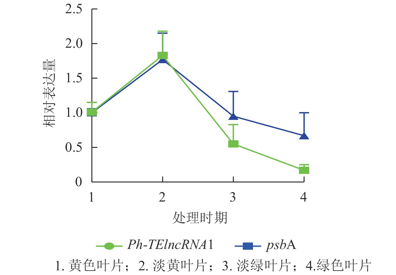 Ph-TElncRNA1的靶基因psbA编码光系统Ⅱ (PSⅡ) 反应中心蛋白 D1,是叶绿体的重要组成部分。通过对叶片着色的4个时期样本(黄色、淡黄、淡绿、绿色)进行RT-qPCR发现:Ph-TElncRNA1和靶基因psbA在4个时期的相对表达量呈正相关(图7)。根据图7中的表达趋势可知:在淡黄时期,也就是将毛竹放入培养箱2 d时,表达量最高,在这一时期叶绿体正在形成,而光系统Ⅱ (PSⅡ) 反应中心蛋白 D1作为重要的蛋白亚基,也处于表达高峰时期。Ph-TElncRNA1和靶基因psbA在叶绿体形成过程中表达量最高,在叶绿体形成后呈现逐渐下降的趋势。两者在叶片着色过程中,相对表达量的变化趋势呈显著正相关(P=0.000,皮尔逊相关系数为0.926)。